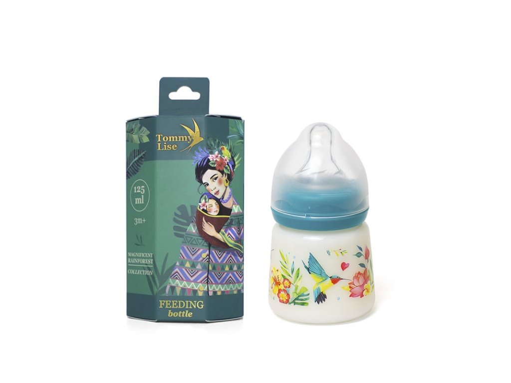 Kojenecké lahve mají široké hrdlo a jsou vyrobeny z kvalitního a nerozbitného polypropylenu. Výrobek neobsahuje škodlivé BPA, savička je opatřena dvojitým antikolikovým systémem. Duální ventil zajišťuje lepší cirkulaci vzduchu, zabraňuje zácpě a tomu, aby se vzduch a plyny dostaly při pití do bříška dítěte. Savička je vyrobena z odolného silikonu a je bez rizika propadnutí, miminku tak zajišťuje maximální komfort při krmení. Užijte si krmení vašich ratolestí spolu s kojeneckou lahví se širokým hrdlem, která pochází z kolekce Magnificent Rainforest. Nechte vaše dítě vyniknout a zazářit díky originální lahvi s hravým designem.Klíčové vlastnosti:-Doporučený věk: od 3 měsíců-Bezpečnost: neobsahuje bisfenol (BPA) a ftaláty-Materiál: polypropylen, silikon-Dvojitý antikolický systém-Široké hrdlo pro jednodušší plnění i údržbu-Silikonová savička neabsorbuje pachy, chutě nebo barvy z potravin-Láhev má měrku pro jednodušší přípravu mléka-Dostupná ve 3 velikostech: 125 ml, 250 ml a 360 ml-Zabalena v krásné papírové krabičce-Doplňkové parametry