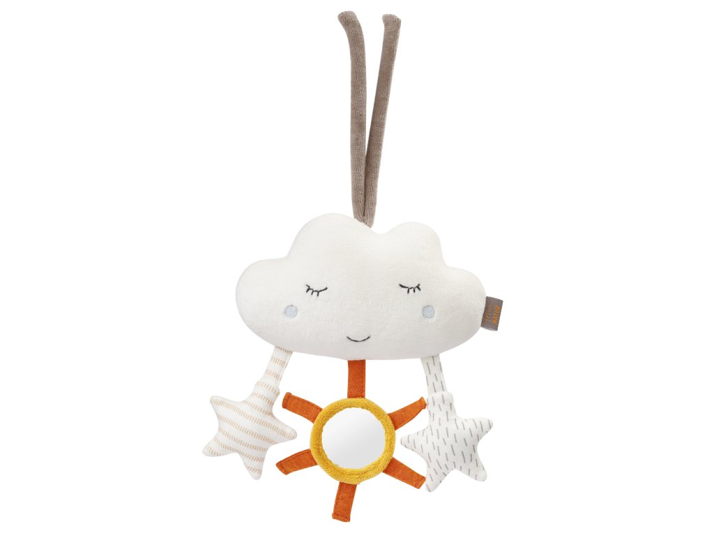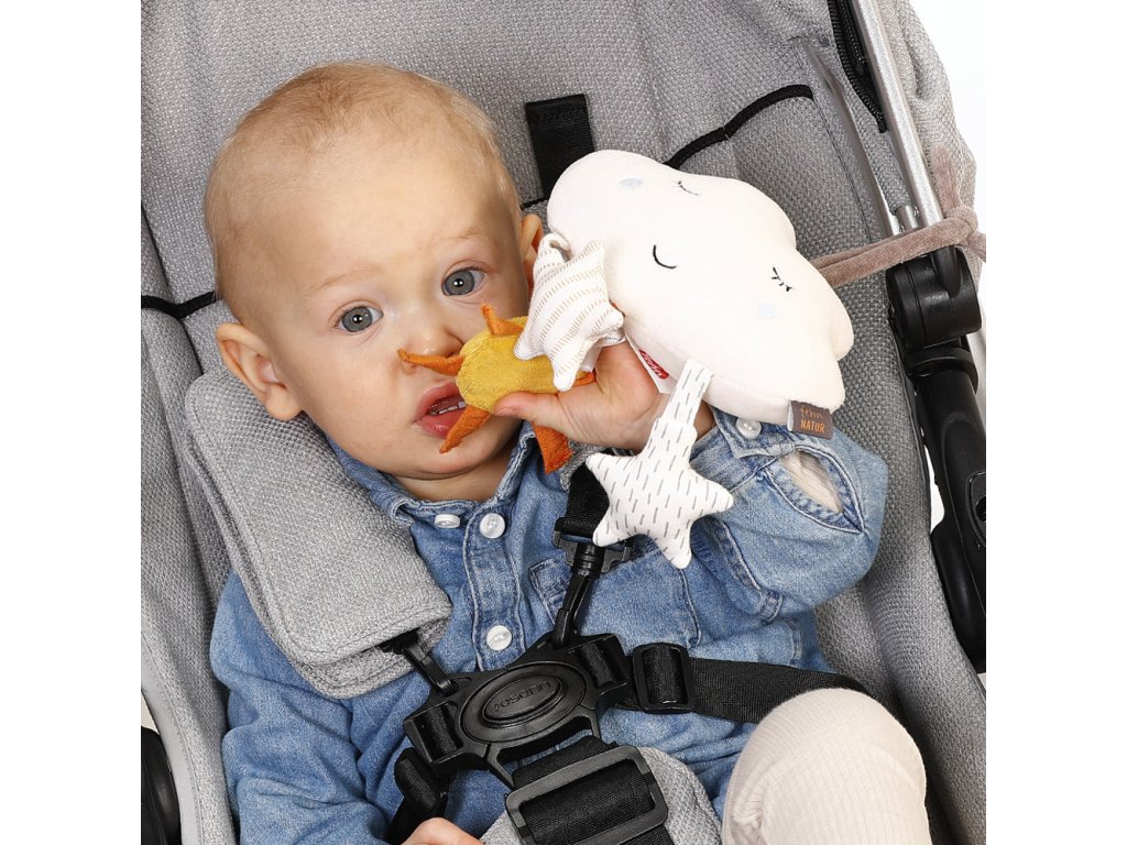 hvězdičky s šustícím papírem a plyšové sluníčko s chrastítkem. Přívěsky pomáhají