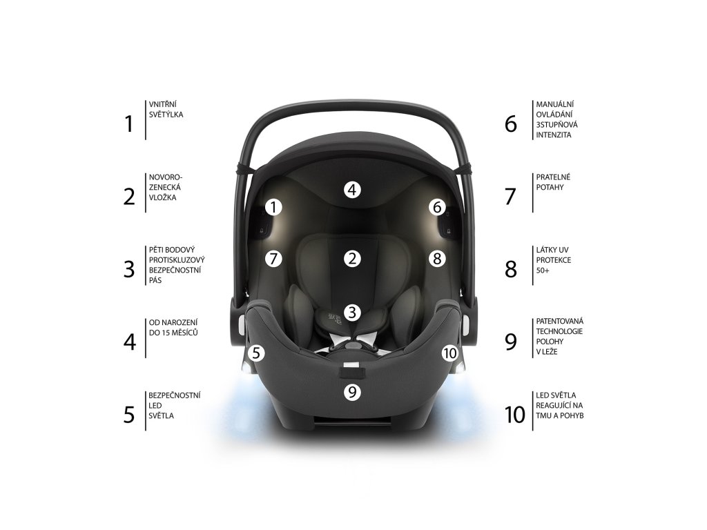 Pak je tady další dvojice světýlek, která má jinou funkci. Teplá, tlumená světýlka uvnitř sedačky vám zajistí, že vždy budete vidět, co vaše miminko zrovna dělá. Světýlka vám v šeru auta pomohou i se snadnějším připoutáním dítěte. Mají nastavitelný automat, kdy se světýlka rozsvítí, vy dítě do sedačky připoutáte a světla po minutě sama zhasnou.