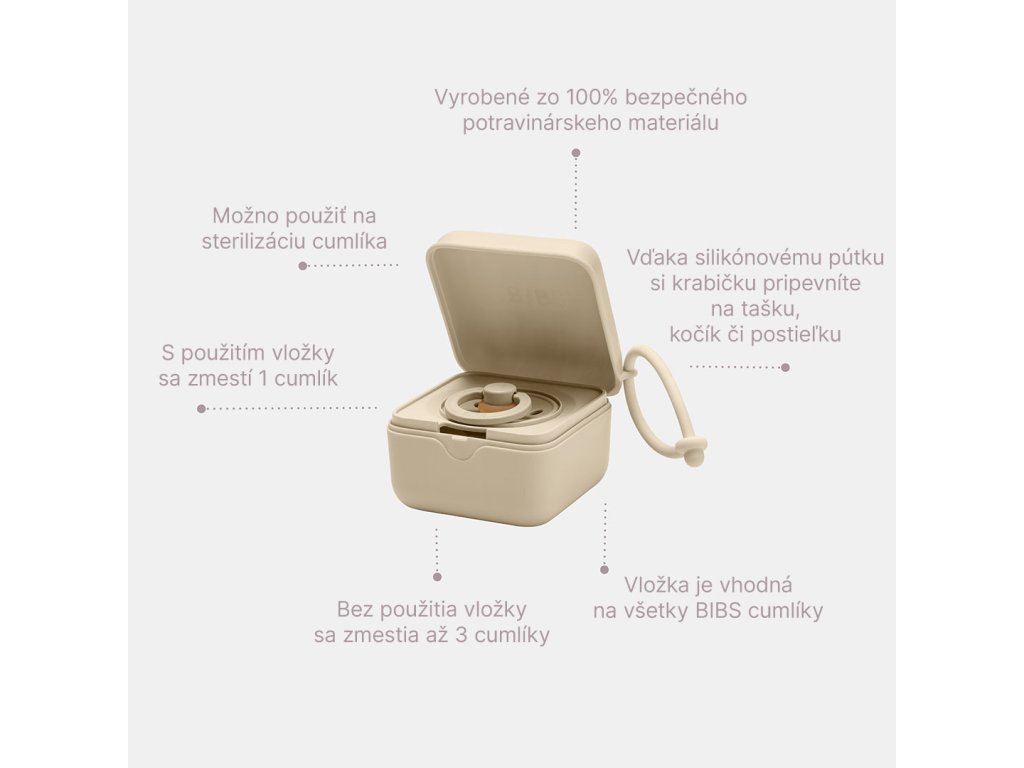 BIBS je obľúbená dánska značka s tradíciou výroby ikonických cumlíkov od roku 1978. Okrem cumlíkov BIBS ponúka aj pestrý prémiový sortiment pre najmenšie deti v minimalistickom škandinávskom dizajne a širokej farebnej palete. Všetky BIBS produkty sú garanciou najvyššej kvality detského sortimentu. Krabička, box, púzdro, obal, ... jednoducho pomocník, ktorý ochráni cumlík pred znečistením, keď ho práve nepotrebujete. No nie len to... BIBS krabička na cumlíky je zároveň aj sterilizačným boxom na sterilizáciu cumlíkov v mikrovlnke alebo šikovnou krabičkou na akékoľvek drobnosti, ktoré chcete mať po ruke kdekoľvek ste. Keďže je vyrobená z bezpečného potravinárskeho materiálu, je vhodná aj ako dóza na drobný snack. Vďaka šikovnému silikónovému pútku si BIBS krabičku na cumlíky pripevníte na tašku, kočík, ku postieľke, či autosedačke. Bez použitia vložky sa zmestia až 3 cumlíky. S použitím vložky sa zmestí 1 cumlík a klip na cumlík. Z jednej strany je vložka určená na cumlíky okrúhlych tvarov ako BIBS Colour, DeLux alebo Boheme a po otočení je vhodná na cumlíky motýlikového tvaru ako BIBS Supreme alebo Couture. Možno použiť na sterilizáciu cumlíka v mikrovlnnej rúre. Vyrobené zo 100% bezpečného potravinárskeho materiálu, preto je krabička vhodná aj na uskladnenie drobného občerstvenia. Navrhnuté a vyrobené v Dánsku. Cumlík na obrázku nie je súčasťou balenia. Certifikáty : V súlade s európskymi normami EN 15284, EN 1186-01, EN 1186-03, EN 1186-14. Návod na sterilizáciu cumlíkov v BIBS krabičke: Pridajte dve lyžice vody do krabičky na cumlík a vložte cumlík. Krabičku vložte do mikrovlnky na cca. 60 sekúnd pri výkone max. 800 W. Teplota by nemala prekročiť 100°C. Dbajte na pokyny výrobcu mikrovlnnej rúry. Pred vybratím cumlíka nechajte krabičku 2 minúty vychladnúť. Odporúčame sterilizovať v mikrovlnnej rúre iba silikónové cumlíky, nie cumlíky z prírodného kaučuku. Používajte opatrne! Počas sterilizácie musí byť produkt mimo dosahu detí. Rozmer : cca 7,5 x 7,2 x 5 cm.Doplňkové parametry