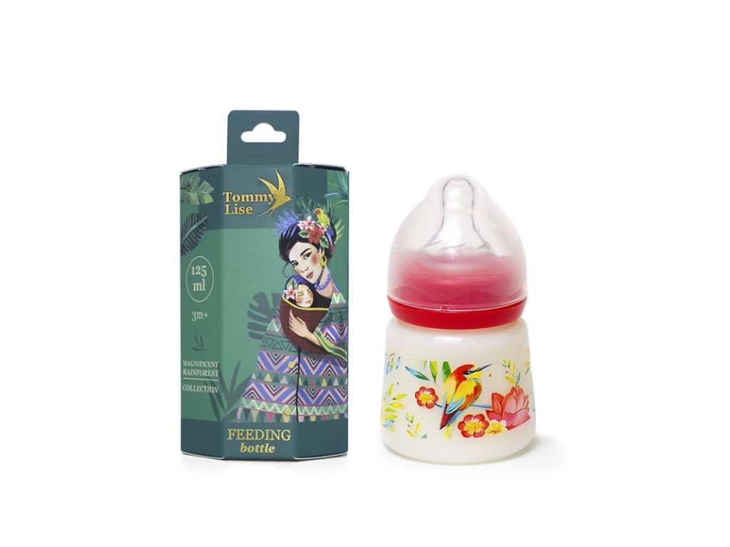 Kojenecké lahve mají široké hrdlo a jsou vyrobeny z kvalitního a nerozbitného polypropylenu. Výrobek neobsahuje škodlivé BPA, savička je opatřena dvojitým antikolikovým systémem. Duální ventil zajišťuje lepší cirkulaci vzduchu, zabraňuje zácpě a tomu, aby se vzduch a plyny dostaly při pití do bříška dítěte. Savička je vyrobena z odolného silikonu a je bez rizika propadnutí, miminku tak zajišťuje maximální komfort při krmení. Užijte si krmení vašich ratolestí spolu s kojeneckou lahví se širokým hrdlem, která pochází z kolekce Magnificent Rainforest. Nechte vaše dítě vyniknout a zazářit díky originální lahvi s hravým designem.Klíčové vlastnosti:-Doporučený věk: od 3 měsíců-Bezpečnost: neobsahuje bisfenol (BPA) a ftaláty-Materiál: polypropylen, silikon-Dvojitý antikolický systém-Široké hrdlo pro jednodušší plnění i údržbu-Silikonová savička neabsorbuje pachy, chutě nebo barvy z potravin-Láhev má měrku pro jednodušší přípravu mléka-Dostupná ve 3 velikostech: 125 ml, 250 ml a 360 ml-Zabalena v krásné papírové krabičce-Doplňkové parametry
