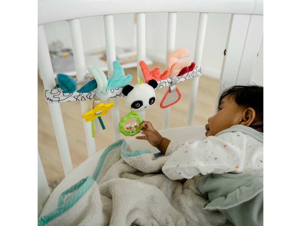 Díky dvěma svorkám lze řetěz flexibilně připevnit ke kočárku, dětské autosedačce, postýlce, ohrádce nebo hracímu oblouku a je proto vhodný na doma i na cesty.