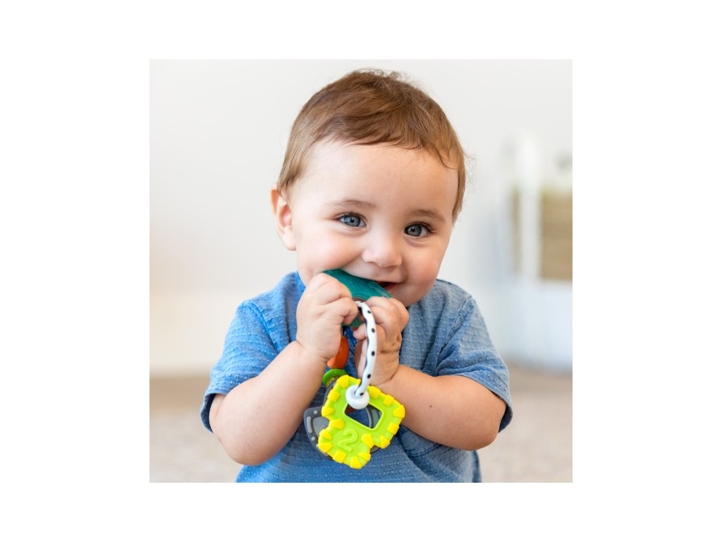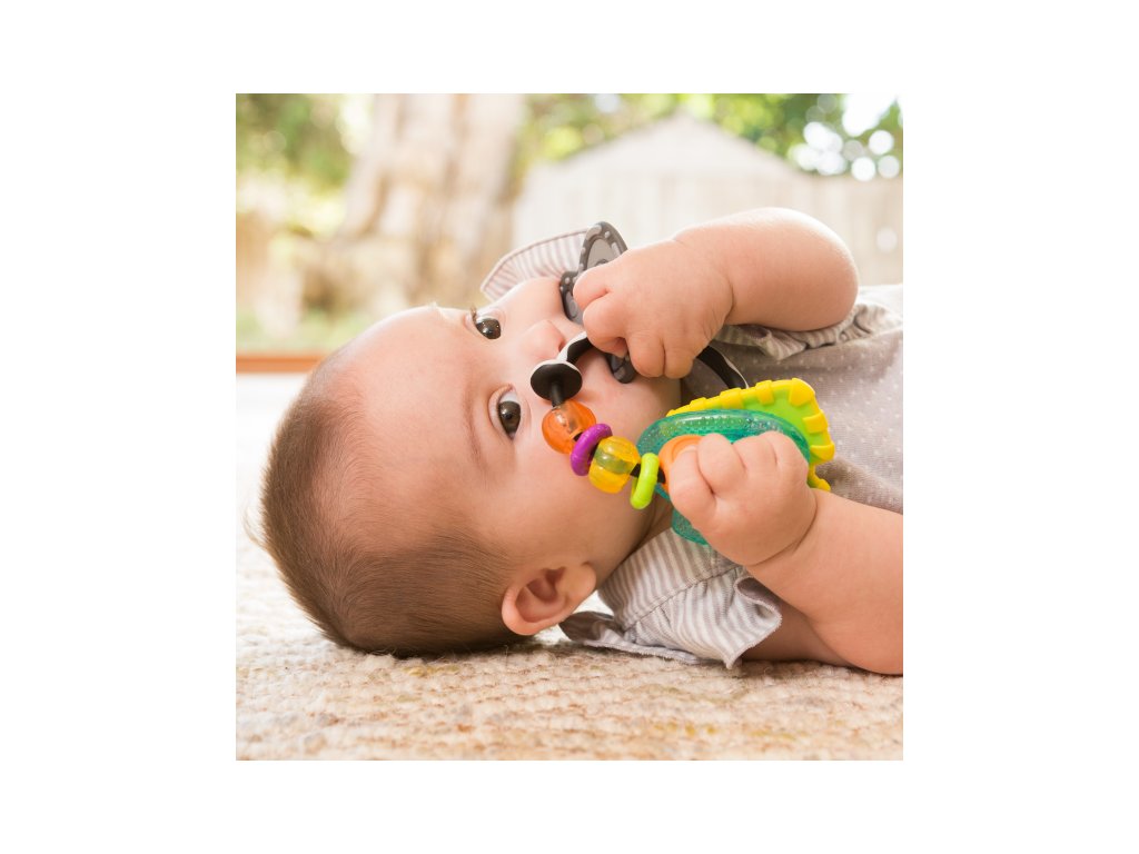 Chrastítko a kousátko ve výrazných barvách dítě zabaví i uleví jeho citlivým dásním při prořezávání zoubků. Tvar hračky umožňuje snadné uchopení dětskými ručičkami. Vhodné od narození.Doplňkové parametry