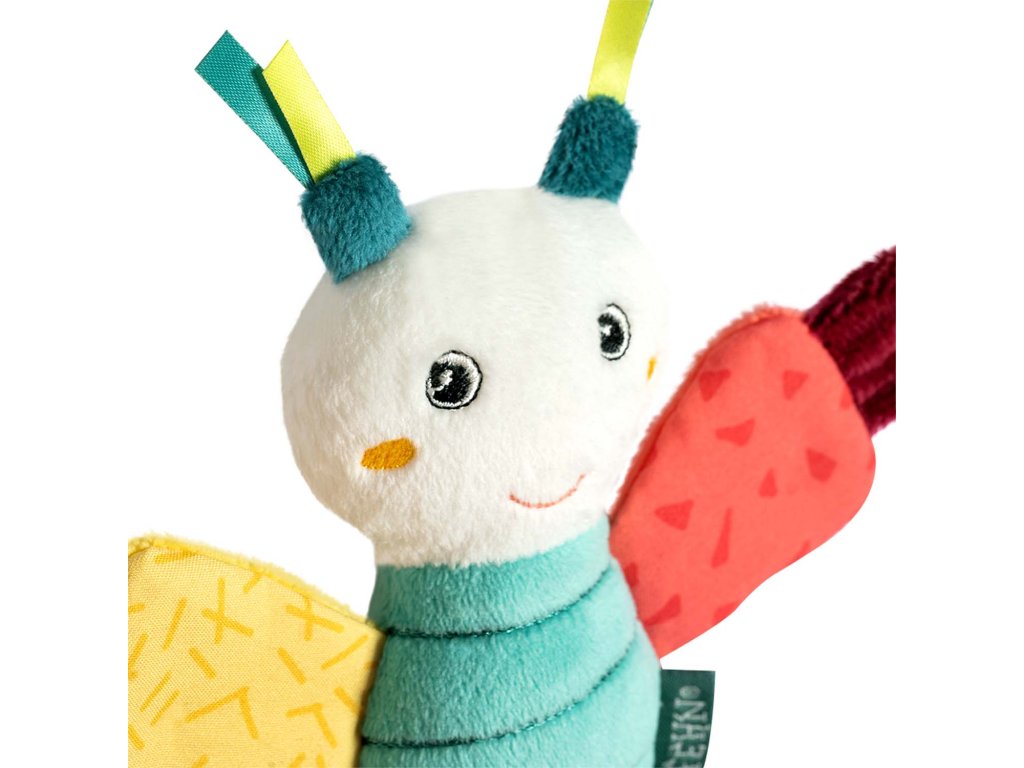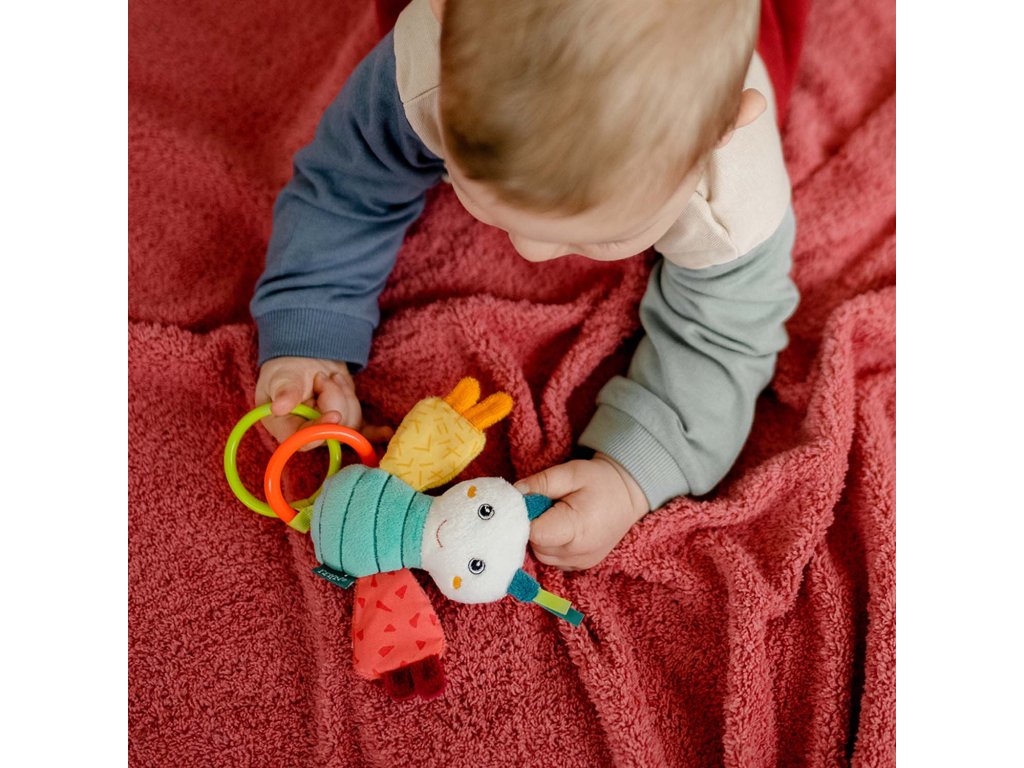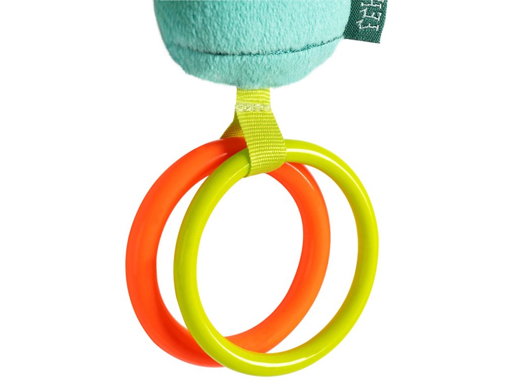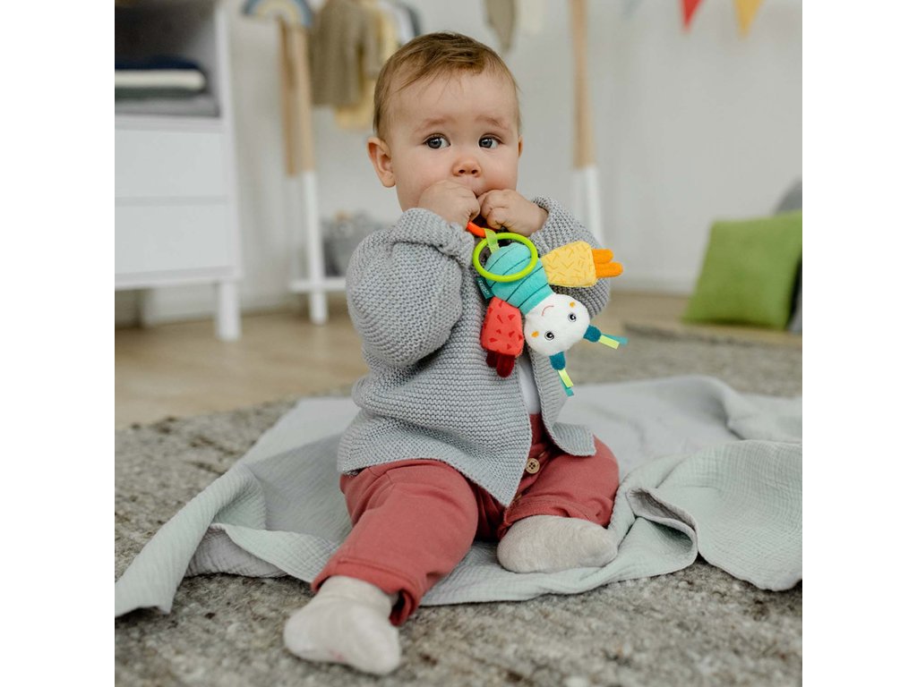Plyšové chrastítko se spoustou aktivity prvků jako je úchopový kroužek, chrastítko, pískací mechanismus a skřípavý papír. Hračka na uchopení hravě podporuje sluch dítěte, smysl pro zrak, hmat, zdravé uchopení– ideální jako dáreček pro chlapce a dívky k narození, narozeninám či křtu.