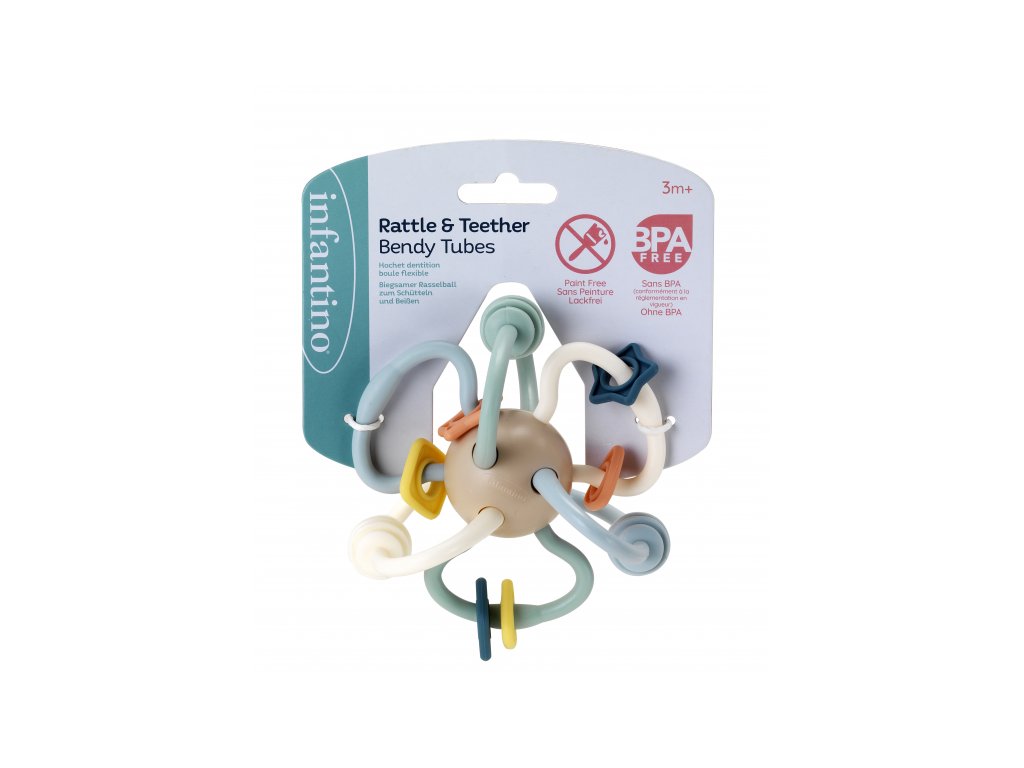 Chrastítko s kousátky Infantino láká miminko k objevování tvarů a textur. Hračka nabízí posuvné korálky a pružné smyčky, při pohybu jemně chrastí a funguje i jako kousátko, které pomáhá při prořezávání prvních zoubků dítěte. Tvar chrastítka je navržen pro snadné uchopení malými dětskými ručičkami. Chrastítko podporuje rozvoj jemné motoriky dítěte i jednotlivých smyslů. Vhodné pro děti od 3 měsíců.Doplňkové parametry