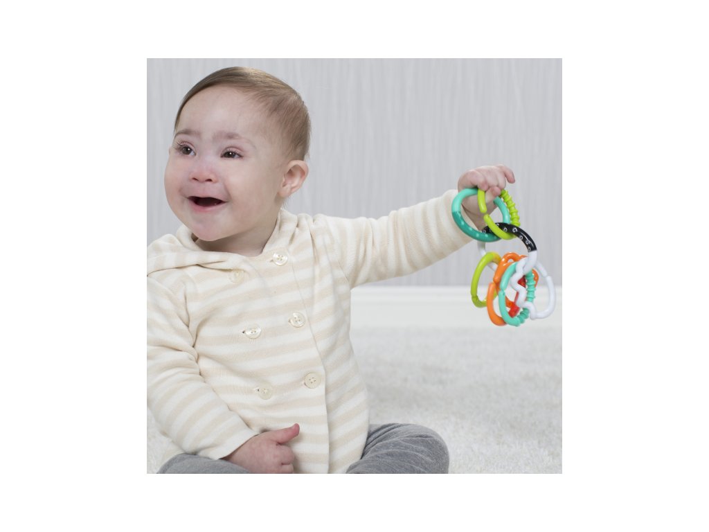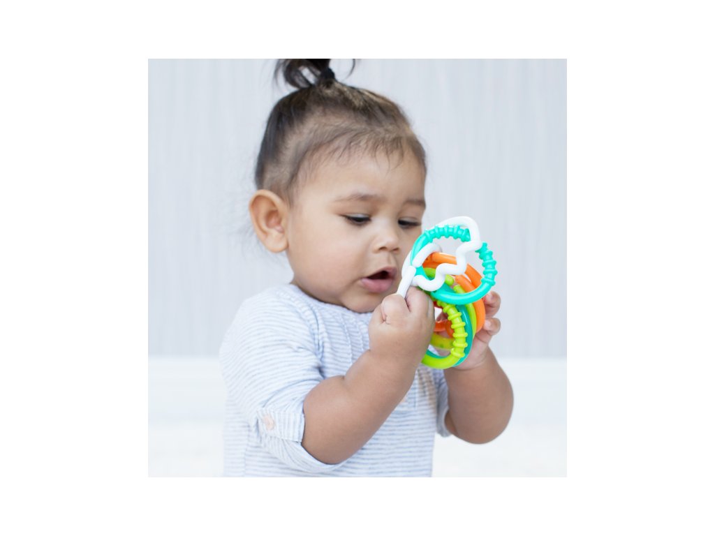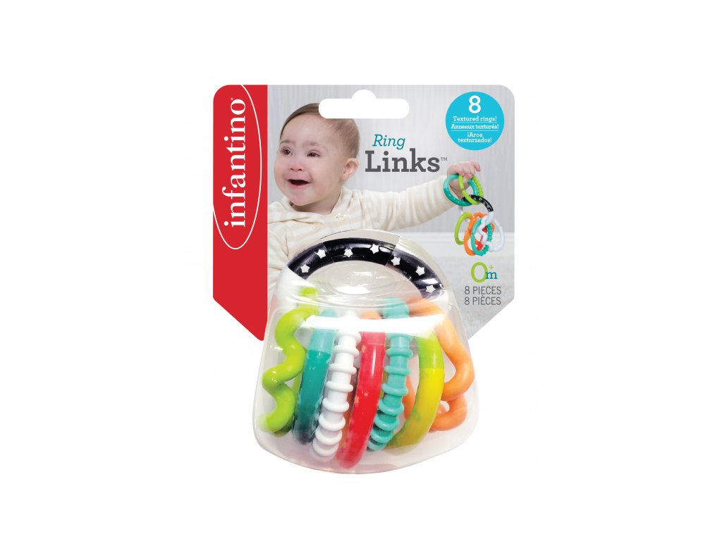 Lehké a snadno uchopitelné chrastítko pro nejmenší je tvořené z osmi navzájem propojitelných kroužků, které můžete různými způsoby spojovat i používat samostatně. Každý kroužek nabízí jinou texturu ke zkoumání rukama i ústy. Vhodné pro děti od narození.Doplňkové parametry