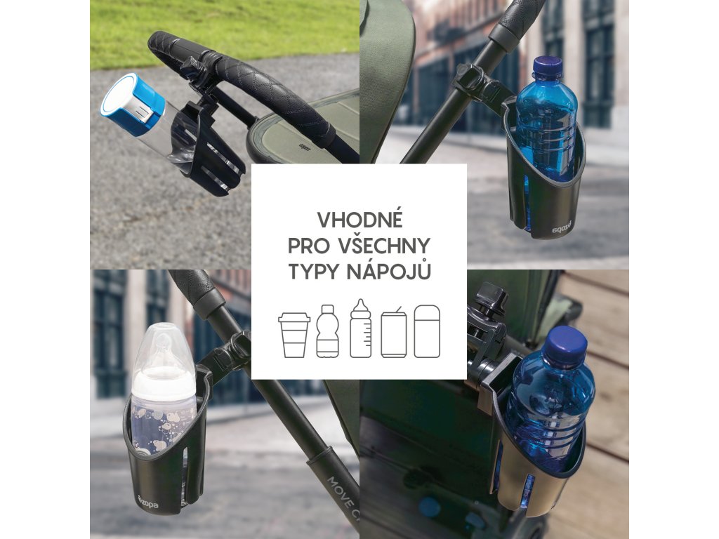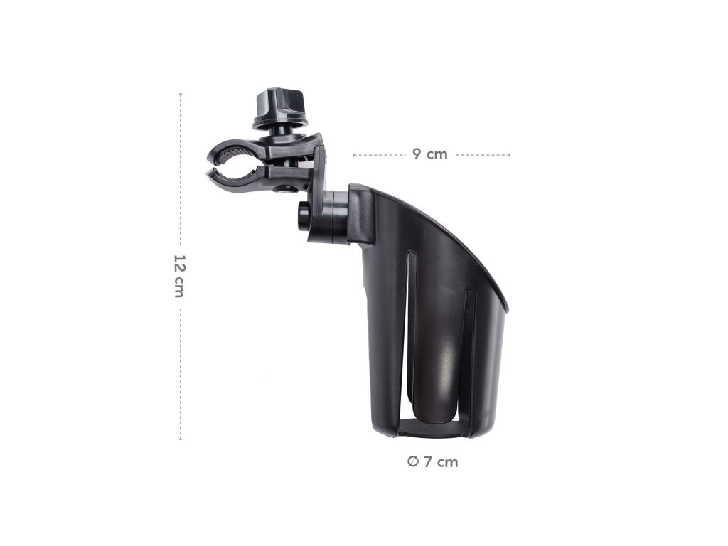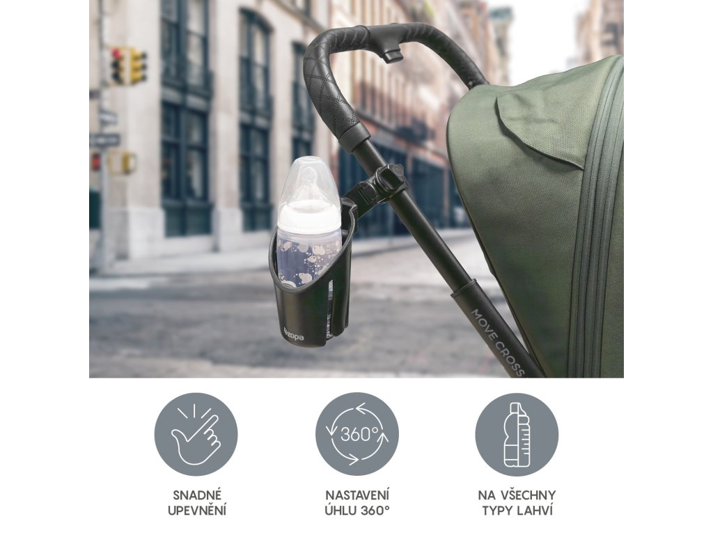 Držák na lahev s pitím vhodný na většinu typů kočárků, ale také na dětská kola, kočárky pro panenky apod. Klapky drží lahev pevně na svém místě a díky tlačítkům lze držák nastavit do potřebného úhlu. Držák se snadno připevní i odejme.