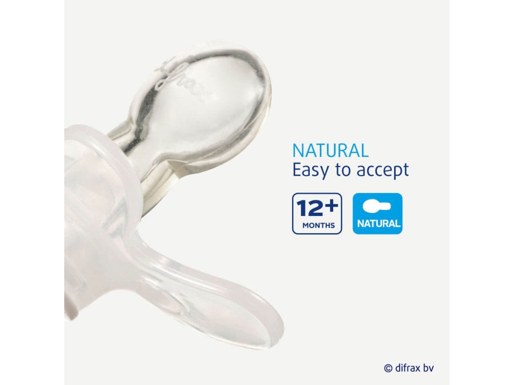 Dudlík Difrax uklidňuje dítě i matku. Náš dudlík vám nabízí pohodlí a dítěti klid, tím že se vaše dítě při cumlání cítí bezpečně, i když nejste u něj. Prořezávající se zoubky vytvářejí tlak v dásních a první pomocí bývá dudlík. Navíc je dudlík je šetrnější k zubům než palec, je hygieničtější a bezpečnější. A odvykání od dudlíku je také snazší než odvykání od sání palce. Anatomicky tvarovaná silikonová savička je svou tvrdostí kompromisem mezi měkčí u dudlíku 6+ a tvrdší u 18+. Pro miminko je tak dudlík 12+ začátkem pro postupné odvykání si od dudlání.