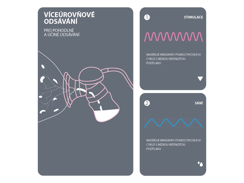 Unikátní technologie, která dokonale napodobuje přirozené sání dítěte. Zaručí maximální efektivitu a bezbolestné odsávání.