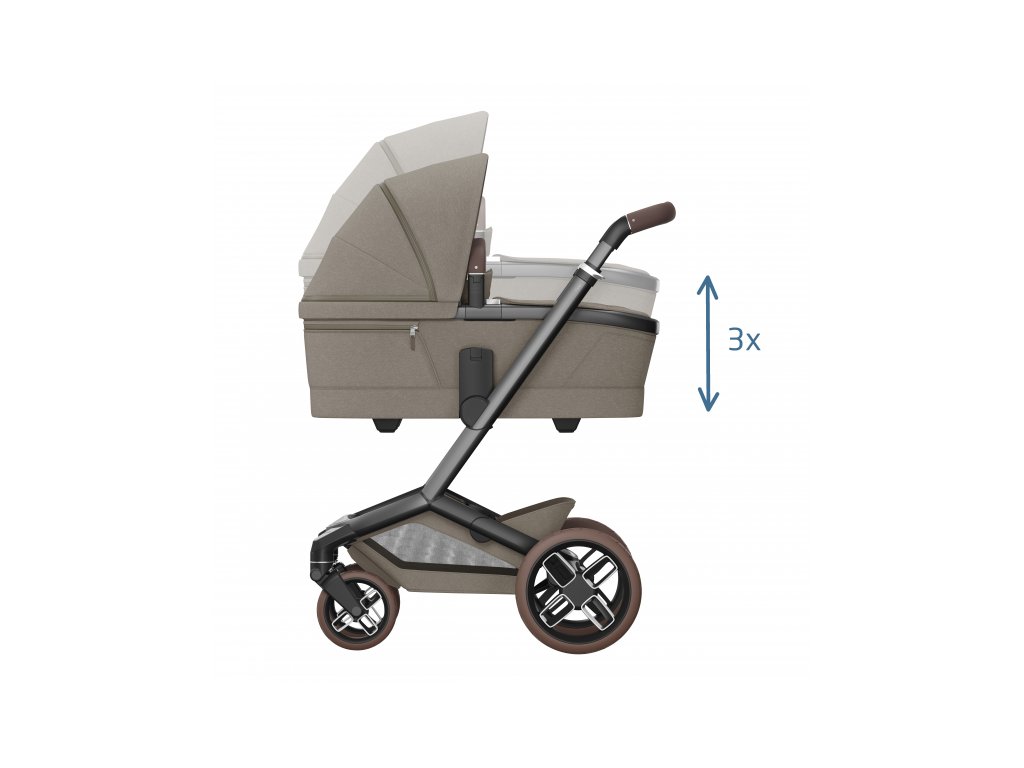Nadčasový luxusní kočárek Maxi-Cosi Fame je skutečně průkopnický kočárek, který přenese dnešní rodiny do budoucnosti. Nadchne vás svými inovativními fukcemi, moderní estetikou i prémiovými detaily. Rodičům i jejich dítěti kočárek poskytuje maximální úroveň pohodlí od narození až do 4 let. Prostorná korbička s oboustrannou prodyšnou matrací z paměťové pěny a ventilačním okénkem poskytne vašemu miminku pohodlí při spánku a optimální větrání i během teplých letních dní. Integrovaný systém SoothingSlope umožňuje jednoduchým způsobem vytvořit lehce nakloněnou polohu pro spaní, která pomáhá minimalizovat riziko refluxu. Unikátní systém výškového nastavení korbičky Close2Me nabízí 3 různé polohy korbičky dle výšky rodiče. Už žádná bolavá záda při manipulaci s dítětem v korbičce! Sportovní sedák je vybaven odnímatelnou ultra polstrovanou podložkou z paměťové pěny pro maximální pohodlí dítěte při sezení i spaní. Během horkých letních dnů je možné podložku zcela vyjmout, opěrka sedáku ze síťoviny ClimaFlow maximalizuje ventilaci a pomáhá udržovat dítě v tepelném komfortu. Sedák nabízí tři polohy opěrky zad včetně rovné polohy pro přirozené spaní a pohodlnou nastavitelnou opěrku nohou. 5-bodové bezpečnostní pásy s magnetickou přezkou usnadňují poutání dítěte. Inovativní podvozek kočárku Fame je vybaven integrovaným systémem LED osvětlení LumiRide, díky kterému budete s kočárkem bezpečně viditelní i za tmy. Nabíjecí powerbanku osvětlení podvozku můžete využít i pro nabití vašeho mobilu na cestách. Špičkové odpružení všech čtyř kol se systémem CosiCruise umožňuje super plynulou jízdu na jakémkoli povrchu. Podvozek snadno a rychle složíte do kompaktního samostatně stojícího tvaru včetně sedáku, který může být umístěný po i proti směru jízdy. Kočárek Fame je kompatibilní s autosedačkami Maxi-Cosi kategorie 0-13 kg včetně inovativních autosedaček řady 360 Pro s revoluční technologií SlideTech®. Snadné použití Výškově nastavitelná korbička Close2Me Možnost složení korbičky do kompaktního plochého tvaru pro snadné skladování a přepravu Paměťová tlačítka pro rychlé a snadné uvolnění korbičky / sedáku /autosedačky z podvozku Podvozek skládací do kompaktního stojícího tvaru včetně sedáku v obou smětech Bezpečnostní pásy s magnetickým uzávěrem držící otevřené pro snadnou manipulaci s dítětem Výškově nastavitelná teleskopická rukojeť kočárku pro přizpůsobení kočárku výšce rodiče Pohodlí Prostorná korbička s integrovaným systémem SoothingSlope pro vytvoření jemně nakloněné polohy pro spaní miminka s refluxem Oboustranná prodyšná matrace z paměťové pěny se snímatelným potahem pro komfort miminka Velká rozšiřitelná stříška korbičky pro maximální ochranu před sluncem i větrem Integrované větrací okénko ze síťoviny ClimaFlow v přední části korbičky i ve stříšce pro udržení příjemné teploty v korbičce během teplých letních dní Otočné madlo korbičky i sportovního sedáku pro snadnou manipulaci s dítětem a pohodlné přenášení korbičky Velká kola do každého terénu odolná proti propíchnutí a odpružení všech čtyř kol CosiCruise pro hladkou jízdu Přední otočná kola se snadným způsobem aretace Ultra polstrovaná sedací podložka z paměťové pěny pro pohodlné sezení Velká rozšiřitelná stříška sedáku s UPF 50+, síťovaným větracím okénkem a sluneční clonou Prodyšná zádová opěrka sedáku ze síťoviny ClimaFlow pro příjemné sezení během teplých letních dní Bezpečnostní pásy s polstrováním všech částí pásů pro pohodlí dítěte Chytré detaily Extra praktické integrované kapsy na korbičce i sedáku pro bezpečné uložení vašich cenností Ikonický podvozek s integrovaným LED osvětlením LumiRide pro osvětlení cesty i zvýšení vaší viditelnosti s kočárkem i za tmy, mlhy apod. Možnost ovládání osvětlení s pomocí vašeho mobilu Integrovaná powerbanka vhodná i pro dobití mobilu na cestách a procházkách Velký úložný košík s osvětlením a nosností až 10 kg / objemem 32 l Snadné ovládání nožní brzdy sešlápnutím pro zabrždění i odbrždění kočárku bez rizika odření bot Špičkový voděodolný textilní potah kočárku pro snadnou údržbu Součástí kočárku jsou adaptéry na připevnění autosedačky. Ke kočárku je možné dokoupit pláštěnku, moskytiéru, sluneční clonu a fusak. Kočárek je vhodný od narození do 22 kg (do 48 měsíců). Korbička je určena dětem od narození do 6 měsíců (do 9 kg). Technické údaje: Kočárek se sedákem: Hmotnost: 13,5 kg Rozměry (V x Š x H): 98–110 x 61,5 x 86,8–95,5 cm Korbička: Hmotnost bez matrace: 5,67 kg Hmotnost s matrací: 6 kg Rozměry se stříškou (V x H x Š): 64,5 cm x 87 cm x 42,5 cm Rozměry matrace: 78 x 35 cm Podvozek: Hmotnost podvozku: 9,9 kg Rozměry složeného bez koleček: 68 x 30 x 61,5 cm Rozměry složeného se sedákem a kolečky: 67,5 x 47,6 x 61,5 cm Průměr koleček: zadní 30 / přední 19 cm Upozornění: Nenechávejte dítě v kočárku bez dozoru. Kočárek není vhodný pro běhání nebo jízdu na bruslích. Korbička je vhodná pouze pro děti, které se neumí bez pomoci posadit, převalit nebo zvednout na kolena a ruce.Doplňkové parametry