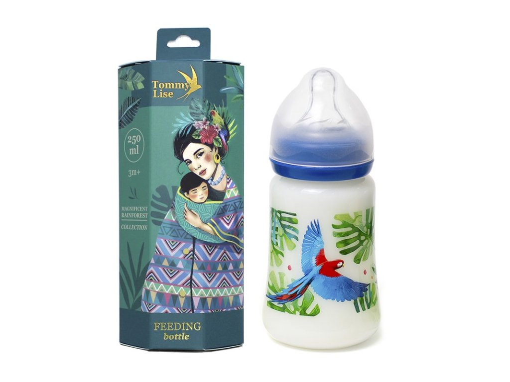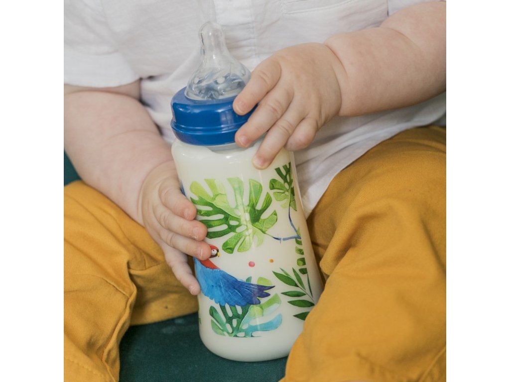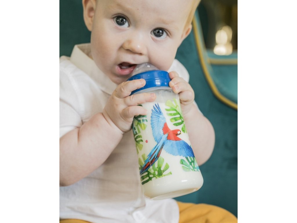 Kojenecké lahve mají široké hrdlo a jsou vyrobeny z kvalitního a nerozbitného polypropylenu. Výrobek neobsahuje škodlivé BPA, savička je opatřena dvojitým antikolikovým systémem. Duální ventil zajišťuje lepší cirkulaci vzduchu, zabraňuje zácpě a tomu, aby se vzduch a plyny dostaly při pití do bříška dítěte. Savička je vyrobena z odolného silikonu a je bez rizika propadnutí, miminku tak zajišťuje maximální komfort při krmení. Užijte si krmení vašich ratolestí spolu s kojeneckou lahví se širokým hrdlem, která pochází z kolekce Magnificent Rainforest. Nechte vaše dítě vyniknout a zazářit díky originální lahvi s hravým designem. Klíčové vlastnosti: -Doporučený věk: od 3 měsíců -Bezpečnost: neobsahuje bisfenol (BPA) a ftaláty -Materiál: polypropylen, silikon -Dvojitý antikolický systém -Široké hrdlo pro jednodušší plnění i údržbu -Silikonová savička neabsorbuje pachy, chutě nebo barvy z potravin -Láhev má měrku pro jednodušší přípravu mléka -Dostupná ve 3 velikostech: 125 ml, 250 ml a 360 ml -Zabalena v krásné papírové krabičce -Doplňkové parametry