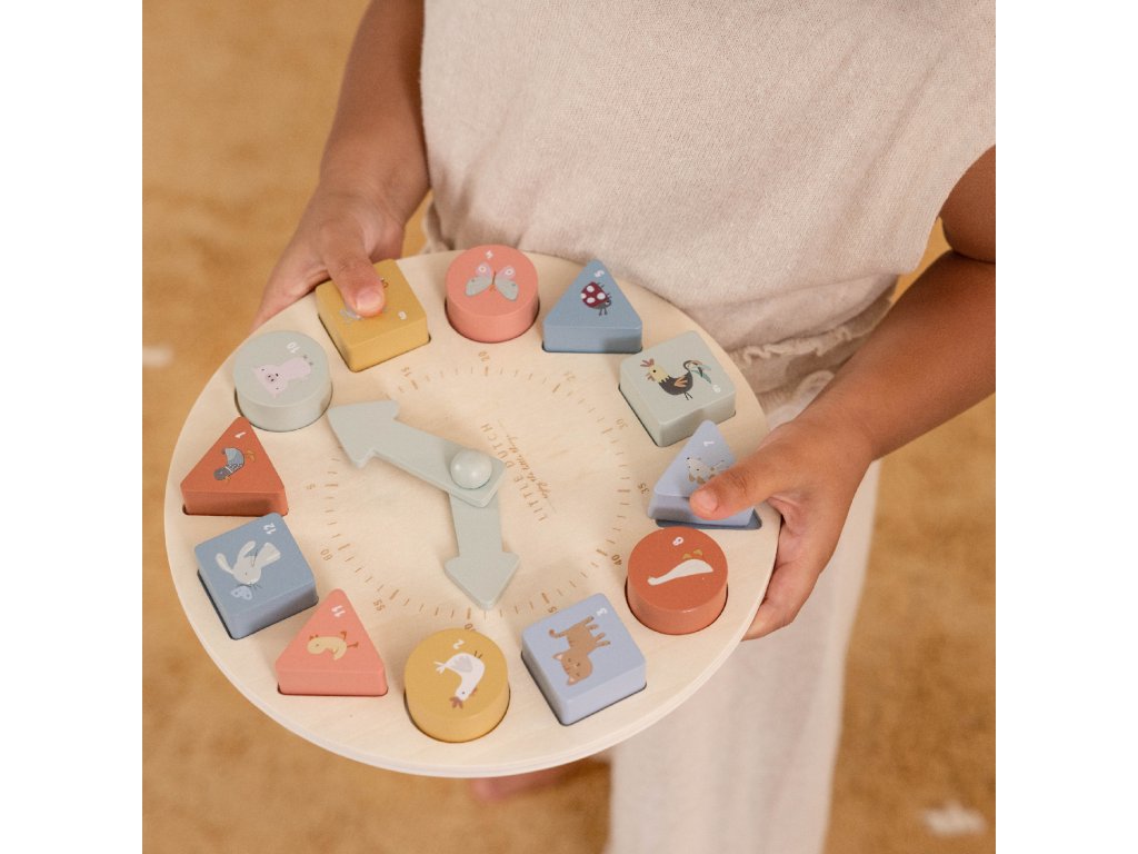 Kolik je hodin? Originální dřevěné puzzle v podobě ručičkových hodin naučí vaše dítě hravou formou poznávat čas. Hodiny mají pohyblivé ručičky a obsahují 12 kostek různých tvarů a barev s čísly, které pasují do odpovídajících otvorů na ciferníku. Pro zábavnější učení je na každé kostce obrázek zvířátka. S pomocí puzzle hodin Little Dutch se děti učí rozpoznávat barvy, čísla a tvary. Rozměry: 22 x 22 x 2,3 cm Vhodné pro děti od 2 let.
