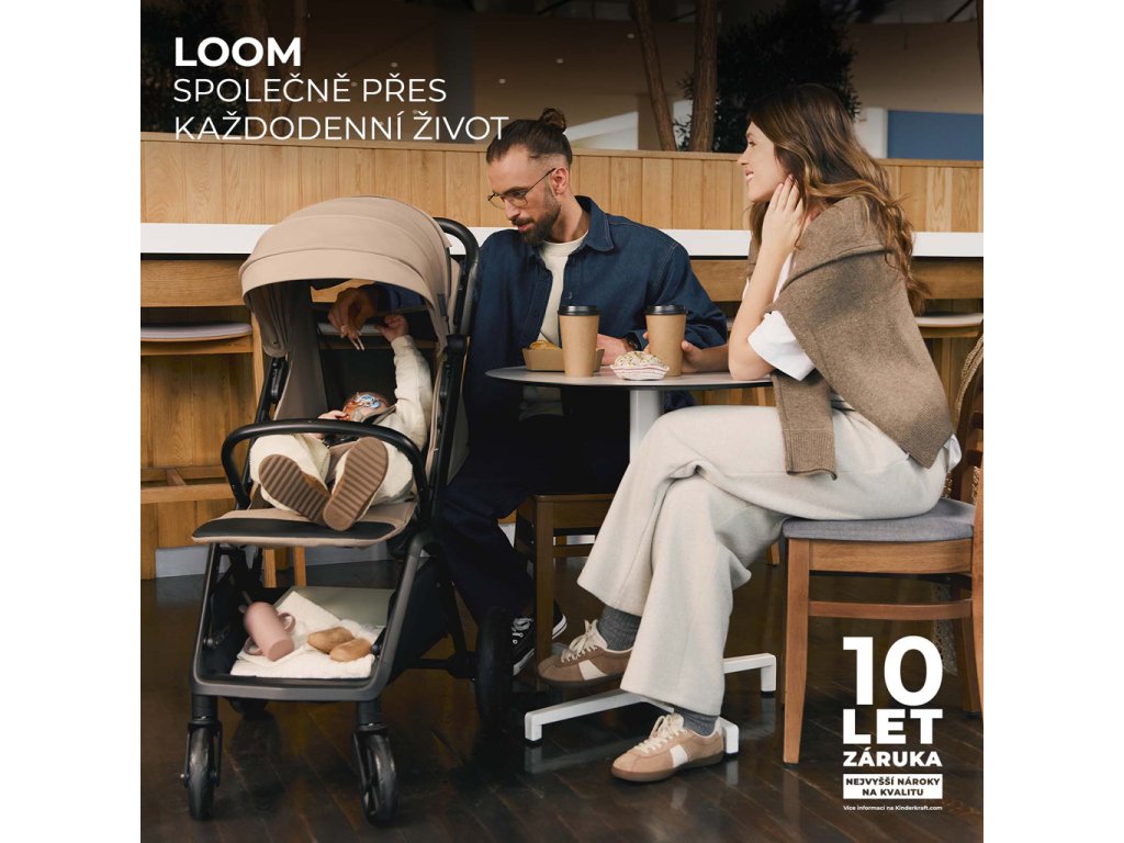 Kočárek Kinderkraft LOOM je lehký a obratný kočárek, ideální pro každodenní použití. Díky kompaktnímu designu a automatickému systému skládání se snadno ovládá a výborně se hodí pro cestování. Je navržen pro děti do 22 kg, což zaručuje pohodlí až do věku 4 let.Kočárek LOOM vyniká svojí ovladatelností – dá se jednoduše řídit jednou rukou a kola odolná proti propíchnutí zvládnou různé terény bez námahy. Stříška chrání před sluncem a větrem, zatímco ventilační panely zajišťují správný průtok vzduchu, čímž zaručují pohodlí během celého roku.