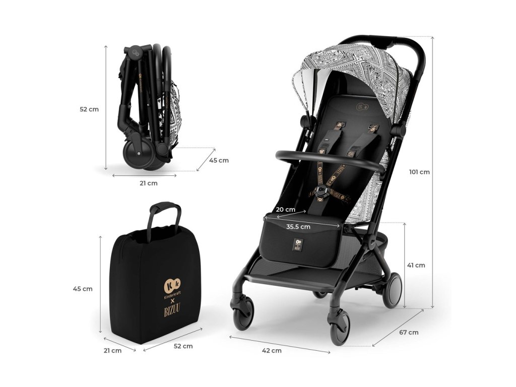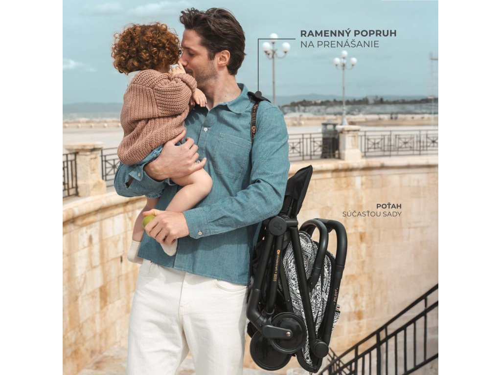 Kočárek je vybaven ochranným krytem, který jej chrání před nečistotami a poškozením při přepravě. Ramenní popruh je natrvalo připevněn ke kočárku a dá se zespodu upevnit, když se nepoužívá, aby nepřekážel při procházce.