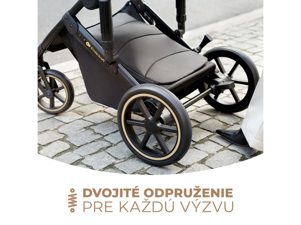 PRIME 2 je zcela odpružený. Týká se to nejen kol, ale také rámu. Kočárek dobře projíždí přes obrubníky a díky velkým nepropichnutelným kolům pro PRIME 2 budou bezpečné nejen městské stezky, ale také lesní stezky. Gumová kola s pěnovou výplní zajistí to, že kočárek dobře tlumí nárazy a na procházku není třeba kola pumpovat.