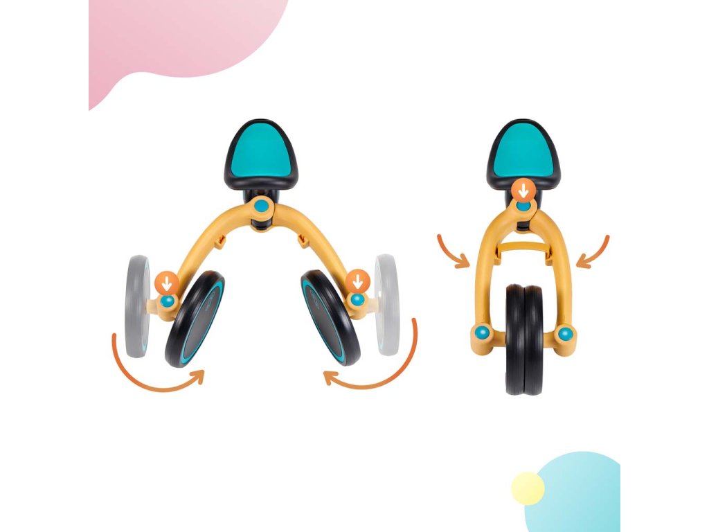 - tříkolka umožňuje jednoduchou a rychlou změnu funkcí. Kolečka stačí otočit a vzájemně spojit, až uslyšíte tiché „kliknutí“, a zablokovat pojistkou! Pro přeměnu odrážedla v tříkolku je nutné vytáhnout pojistku a rozložit nožičky.