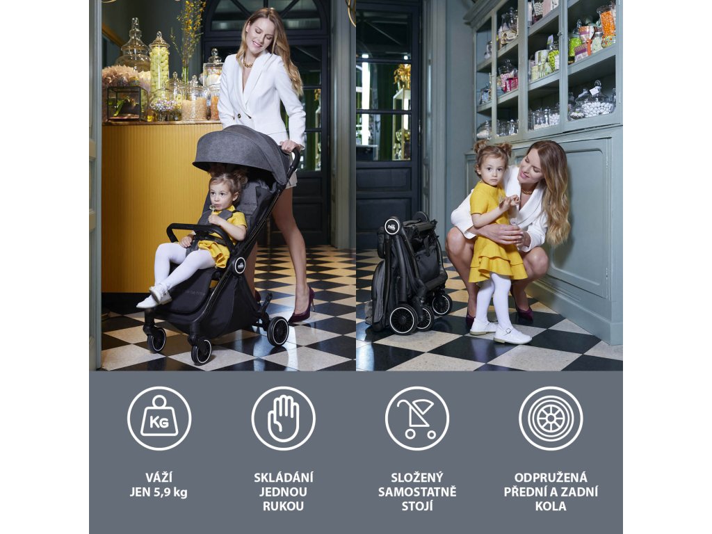 Lehký kočárek, který se složí jednou