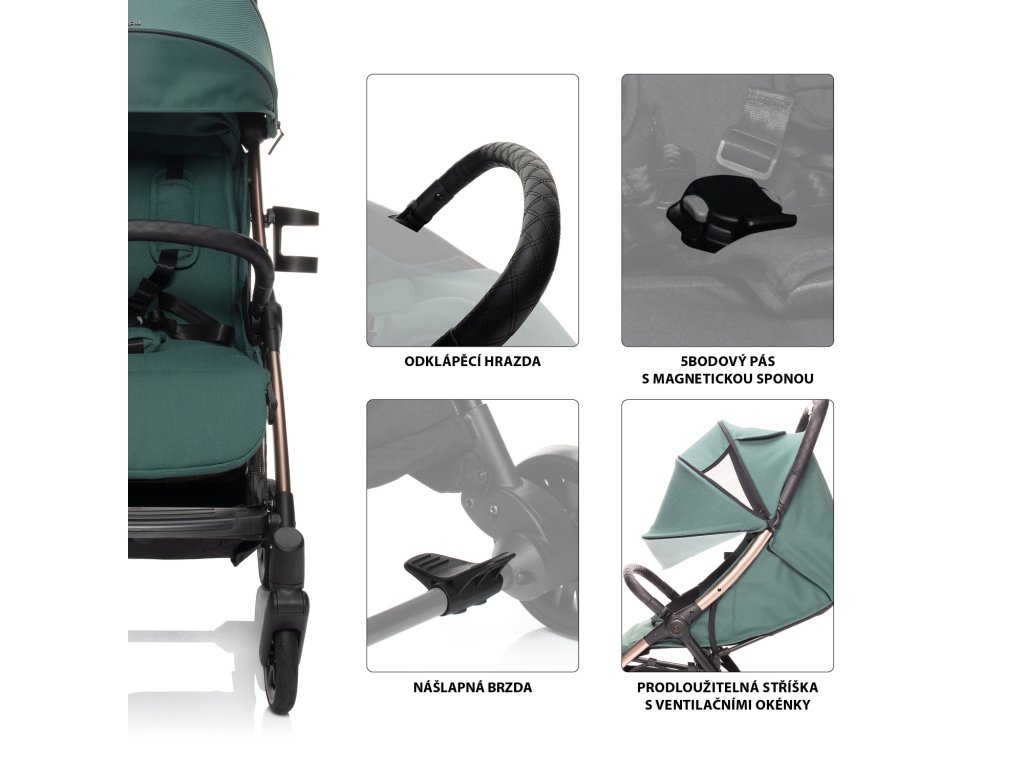 hrazdu kočárku je možné odklopit pro snadnější usazení dítěte. Prodloužitelná