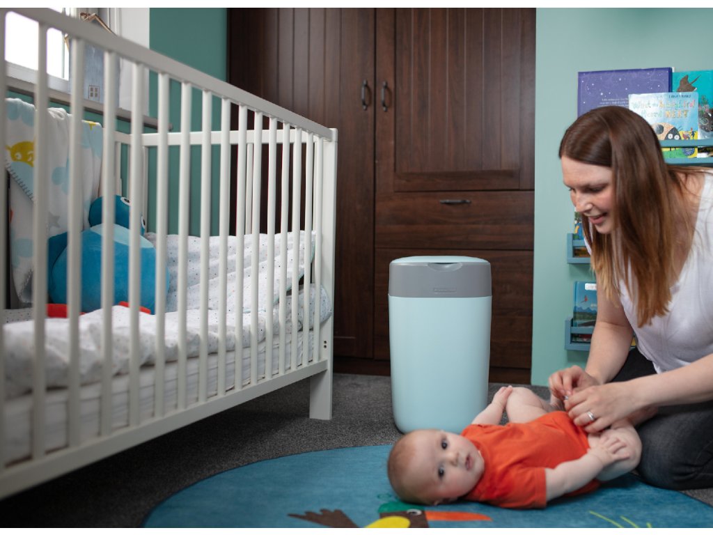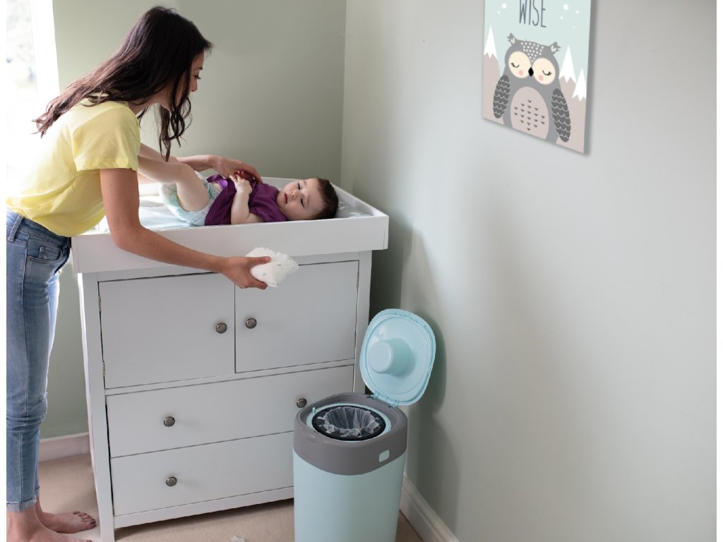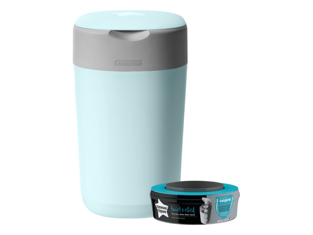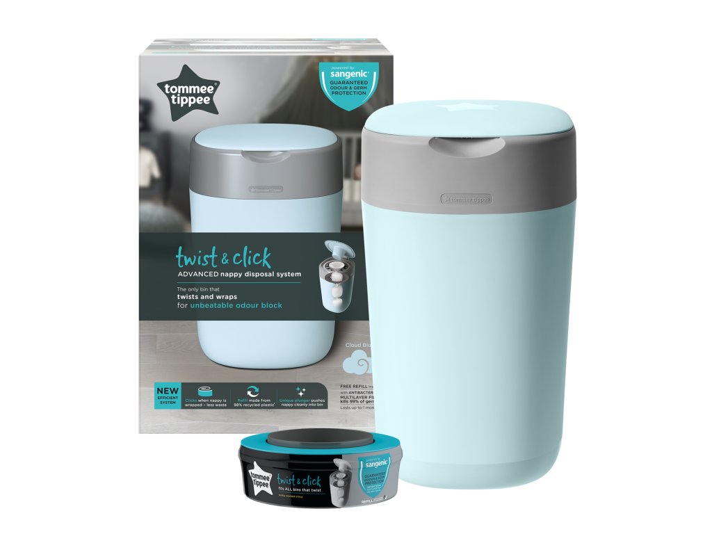 Designový koš na jednorázové pleny Sangenic Twist & Click umožňuje bezdotykové zabalení použitých plen. Stane se nezbytnou součástí vaší domácnosti po celou dobu, kdy vaše dítě používá pleny. Nemusíte se obávat zápachu v místnosti, kde je koš umístěný ani toho, že se do zkoumání použitých plen pustí vaše zvědavé batole či domácí mazlíček. Koš proto můžete mít s klidným srdcem umístěný vedle přebalovacího pultu v dětském pokoji, aby byl vždy během přebalování vždy po ruce. Součástí koše je výměnná kazeta s fólií, jejíž antibakteriální složka zničí 99% bakterií. Koš tak chrání dětský pokoj před zápachem i bakteriemi. Díky technologii Twist & Click se plena v koši zabalí do fólie s příjemnou citrónovou vůní a s pomocí pístu je zatlačena do koše. Plenu do fólie zabalíte otáčením mechanismu pod víkem, kliknutí indikuje úplné zabalení a pomáhá vám tak šetřit spotřebu fólie. Kapacita jedné kazety je až 84 plen (vel. 5-9 kg), při spotřebě 3 plen denně tak jedna kazeta vydrží až jeden měsíc používání. Díky tomu, že koš pojme cca 30 plen, není potřeba jej často vynášet a ušetříte tak mnoho cest k popelnici. Špičkový design koše skvěle doplní váš moderní interiér. Rozměry koše bez víka: Š 28 cm x H 25 cm x V 36 cm