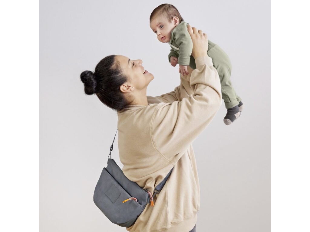 lze připevnit na kočárek pomocí háčků, nosit přes rameno jako kabelku nebo cross bag
