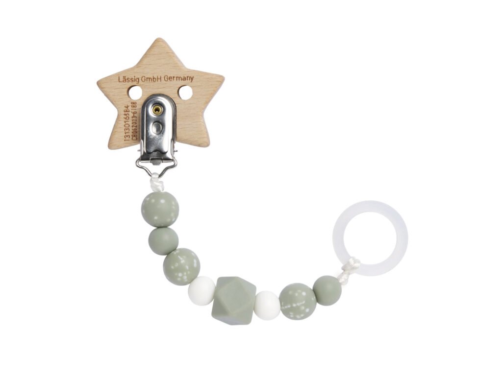 LÄSSIG Soother Holder Wood/Silicone 2024 Little Universe star olive