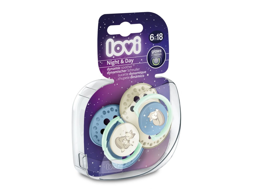 Dynamické dudlíky LOVI® byly vytvořeny ve spolupráci s neurologopedy. Unikátní design nestejnorodé vrstvy silikonu a symetrický tvar inspirovaný matčinou bradavkou. Osvěžující moderní vzory podtrhuje svítící úchyt ve tmě.Night&Day dudlíky – nejdůležitější benefity: