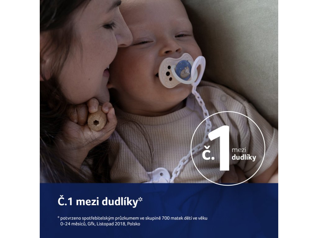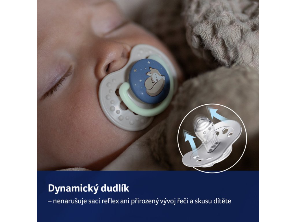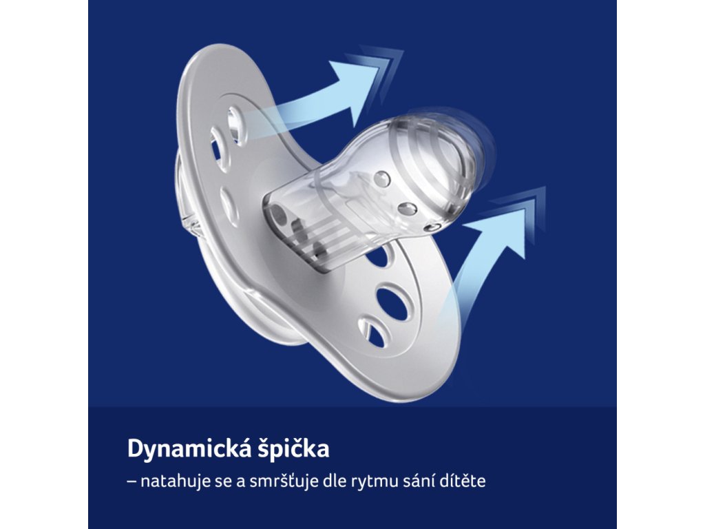 - Dynamická špička - Roztahuje a smršťuje se v závislosti na rytmu sání dítěte č. 1 mezi dudlíky potvrzeno spotřebitelským průzkumem mezi 700 matkami dětí ve věku 0-24 měsíců, GfK, Listopad 2018.