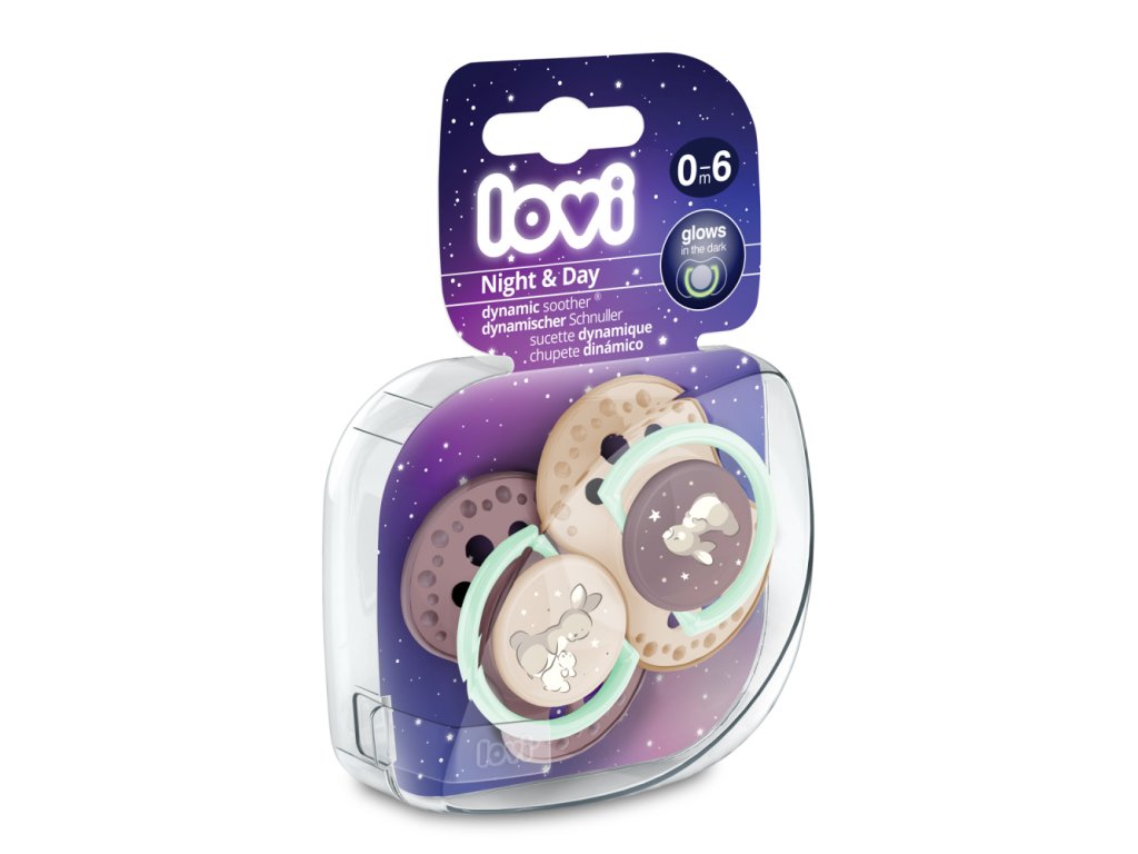 Dynamické dudlíky LOVI® byly vytvořeny ve spolupráci s neurologopedy. Unikátní design nestejnorodé vrstvy silikonu a symetrický tvar inspirovaný matčinou bradavkou. Osvěžující moderní vzory podtrhuje svítící úchyt ve tmě.