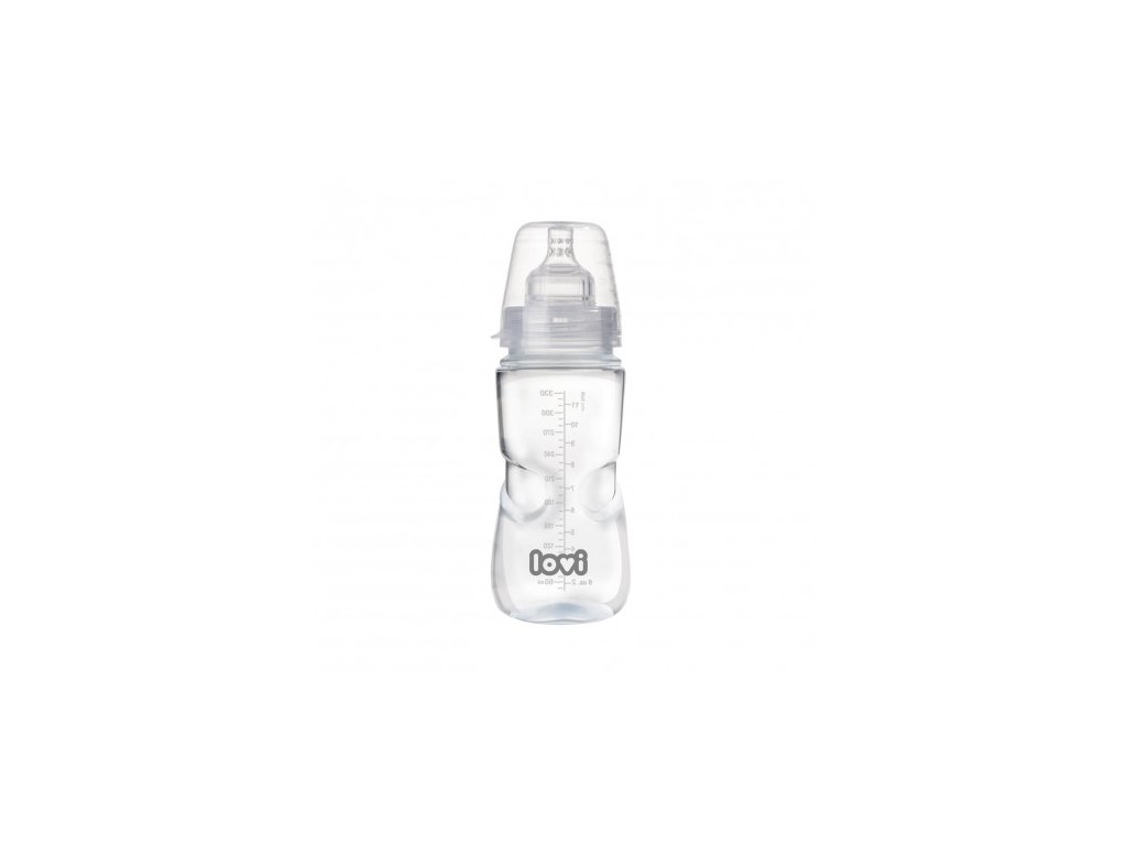Jediná lahev, která povzbuzuje dítě k aktivní činnosti během sání. Obsahuje dynamickou silikonovou savičku LOVI, která při krmení modifikuje svůj tvar (prodlužuje se). Povzbuzuje dítě k aktivní činnosti během sání, stejně jako u kojení, stimuluje místa, která se podílí na rozvoji mluvy a pozitivně ovlivňuje správný vývoj celé dutiny ústní. Obsahuje efektivní systém odvzdušňování SUPER VENT, který zabraňuje vzniku podtlaku a minimalizuje vznik dětské koliky. Speciálně profilovaný tvar lahve umožňuje správný způsob držení. V průběhu krmení se tak lahev pohybuje shodně s rytmem a silou sání dítěte. Lahev obsahuje elastický těsnící disk, který vytvoří z lahve praktický zásobník na uchovávání pokrmu a víčko/hrníček s odměrkou.Dynamická koncovka savičky vyrobená z tenčí vrstvy silikonu, prodlužuje se jako matčina bradavka.Tvrdá, široká, tvarovaná základna vyrobená z hrubší vrstvy silikonu vyžaduje správné přiložení rtů jako při kojení.Kanálky v savičce kopírují laktační kanálky v prsu, regulují průtok a tlak mléka v savičce.Odvzdušňovací systém „SUPER VENT” zabraňuje vzniku podtlaku, minimalizuje vznik dětské koliky.Profilovaný tvar usnadňuje správné držení lahve, které ji umožňuje pohybovat se v dlani v souladu s rytmem sání dítěte.Zásobník na mléko - obsahuje elastický těsnící disk, díky kterému láhev slouží jako těsná nádoba na převážení a uchovávání pokrmu. Hrníček s odměrkou je bezpečnou, alternativní formou podávání tekutin pro novorozence a kojence. Nenarušuje sací reflex dítěte. Lahve LOVI získaly řadu ocenění konečných spotřebitelů:Sada obsahuje:- lahev LOVI 330 ml- dynamickou silikonovou savičku LOVI s pomalým průtokem 3m+ - elastický těsnící disk - šroubovací víčko - víčko/hrníček s odměrkou Informace o způsobu použití lahve:Před každým použitím lahev a všechny její díly důkladně zkontrolujte. Kvalitu savičky vyzkoušejte důkladným natažením všemi směry. Při prvních známkách opotřebení nebo poškození již výrobek dále nepoužívejte – vyměňte jej za nový. Nenechávejte savičku na přímém slunci, v blízkosti tepelného zdroje nebo ve sterilizačních prostředcích déle než je doporučováno, můžete způsobit její oslabení. Před prvním použitím rozmontované díly, lahev a savičku, z hygienických důvodů sterilizujte ve vařící vodě po dobu asi 5 minut. Myjte před každým použitím. Delší vyvařování nebo tvrdá voda mohou způsobit vznik usazenin. Šroubovací víčko nedotahujte příliš silně, protože pak se savička nemůže správně odvzdušňovat. Zkontrolujte, zda pokrm nevytéká zpod šroubovacího víčka. Po použití očistěte od zbytků pokrmu, vypláchněte, umyjte v horké vodě, nevyvařujte. Nedoporučujeme umývat lahev a savičku v myčce nádobí, protože používané mycí přípravky mohou způsobit poškození výrobku. Ovocné šťávy a čaje mohou způsobit zabarvení lahve/savičky, což však nemění jejich vlastnosti. Z hygienických a bezpečnostních důvodů doporučujeme vyměnit savičku po 2 měsících. Důležité! Pro bezpečnost a zdraví vašeho dítěte! Používejte pouze pod přímým dohledem dospělé osoby. Nikdy nepoužívejte savičku jako dudlík. Dlouhodobé sání tekutin může způsobit vady zubní skloviny dítěte. Vždy zkontrolujte teplotu podávaného pokrmu. Neděrujte a nezvětšujte otvory v savičce – můžete způsobit její zničení. Výrobek není hračka. Všechny jeho díly uchovávejte mimo dosah dítěte.UPOZORNĚNÍ: Značka LOVI doporučuje kojení jako nejlepší a nejzdravější formu výživy dítěte. Alternativní formy krmení dítěte vždy konzultujte s pediatrem, porodní asistentkou, dětskou sestrou nebo farmaceutem. Přistupte k němu pouze v případě, že je kojení nemožné nebo nedostačující. Kojenecká lahev odpovídá požadavkům:Nařízení Evropského parlamentu a rady 1935/2004/EC – obecné požadavky na materiály a předměty určené pro styk s potravinamiNařízení Komise (EU) č. 10/2011 o materiálech a předmětech z plastů určených pro styk s potravinamiEN 14350-1 - Výrobky pro péči o dítě - Vybavení pro pití - Část 1: Všeobecné a mechanické požadavky a zkouškyEN 14350-2 - Výrobky pro péči o dítě - Vybavení pro pití - Část 2: Chemické požadavky a zkouškyDoplňkové parametry