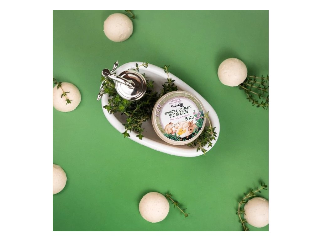 Roztomilé kopečky do vany pro chvíle, kdy se necítíte dobře. Vycházejí z receptury našich Tymiánových mastí.
