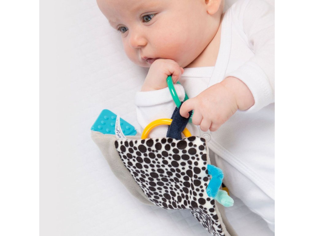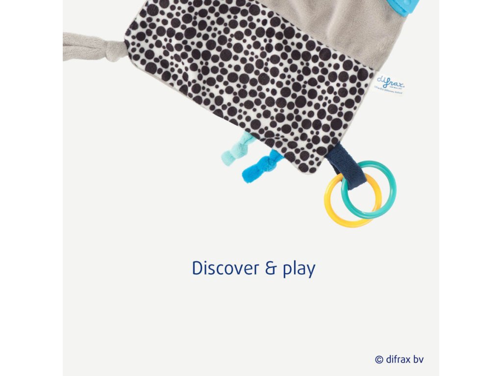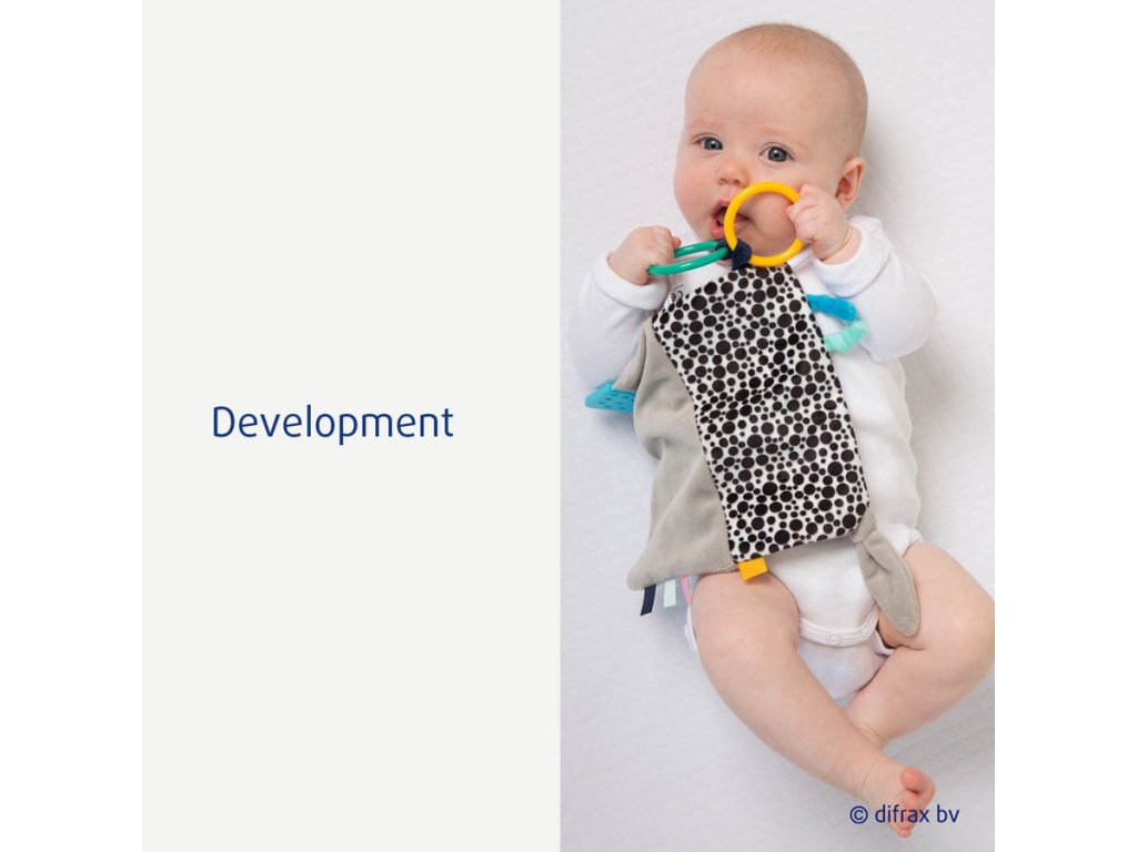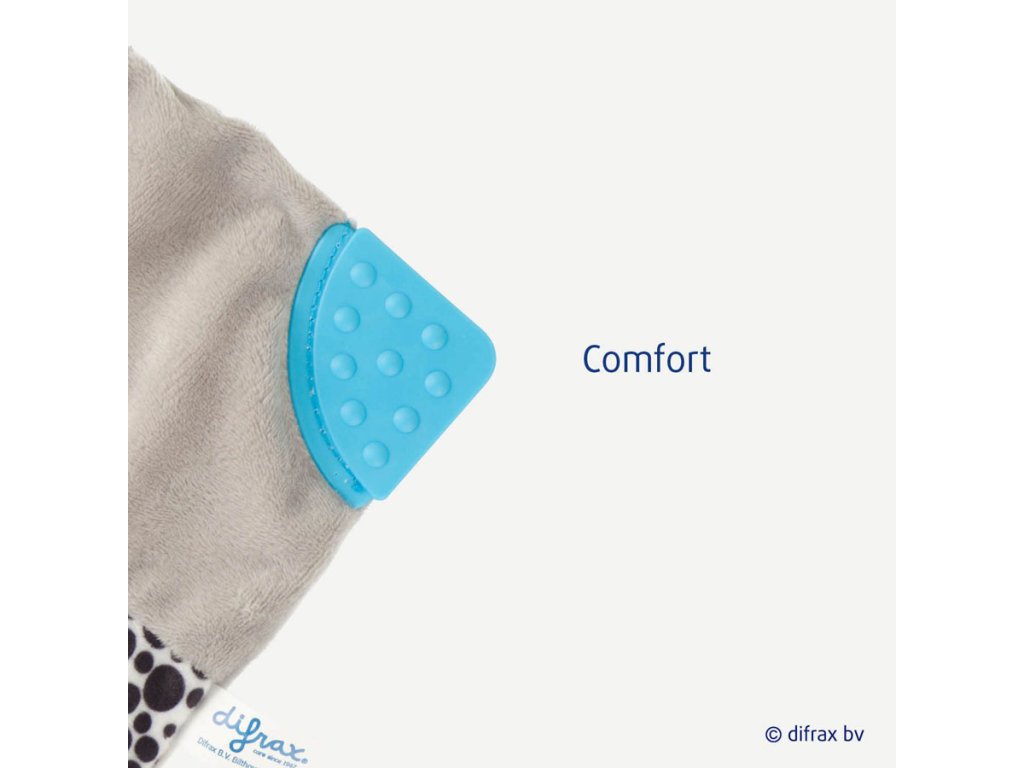 Muchláček Kamarád od Difraxu je z jemného plyše s nápaditým povrchem a kreativními komponenty. Jednotlivé části Kamaráda (vyrobené pokaždé z jiného materiálu, v rozdílných barvách, s odlišnými funkcemi apod.) miminko natolik uchvátí, že se jím zabaví na dlouhé hodiny. Zároveň se při hraní s Kamarádem rozvíjí i jemná motorika miminka a kousátko po stranách muchlátka uleví miminku při nelehkém období růstu zoubků. Muchláček dodává miminku pocit jistoty a pohodlí a šustivé zvuky jej jistě zaujmou.