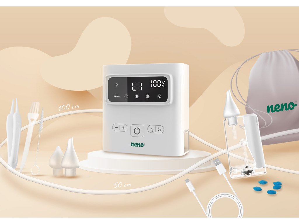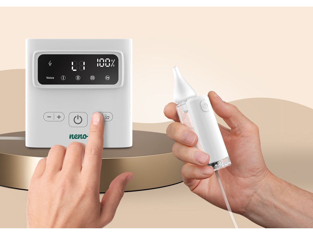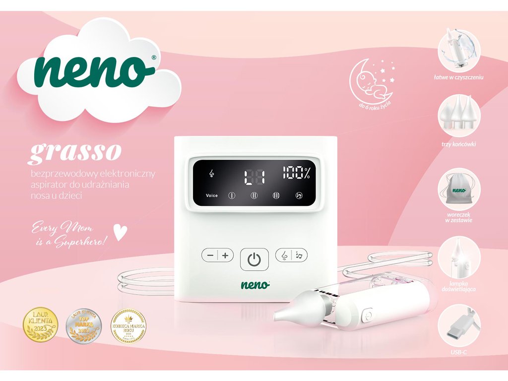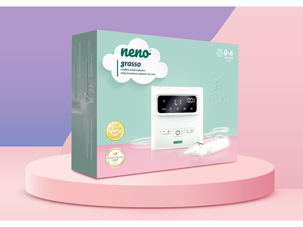 Neno Grasso je bezkabelový elektronický nosní odsavač hlenů pro děti od narození až do 6 let. Profesionální pomocník pro snadné a účinné uvolnění dýchání vašeho dítěte. Šetrně a efektivně odstraňuje hleny různé hustoty, usnadňuje dýchání a zlepšuje pohodu dětí během rýmy i v běžných situacích.Vlastnosti: