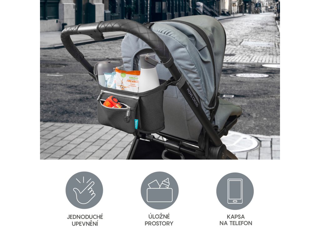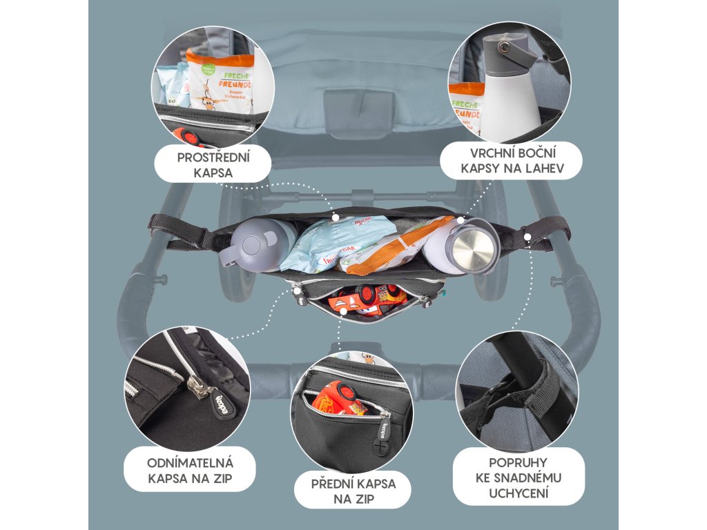 - Díky páskům na suché zipy lze upevnit k většině kočárků