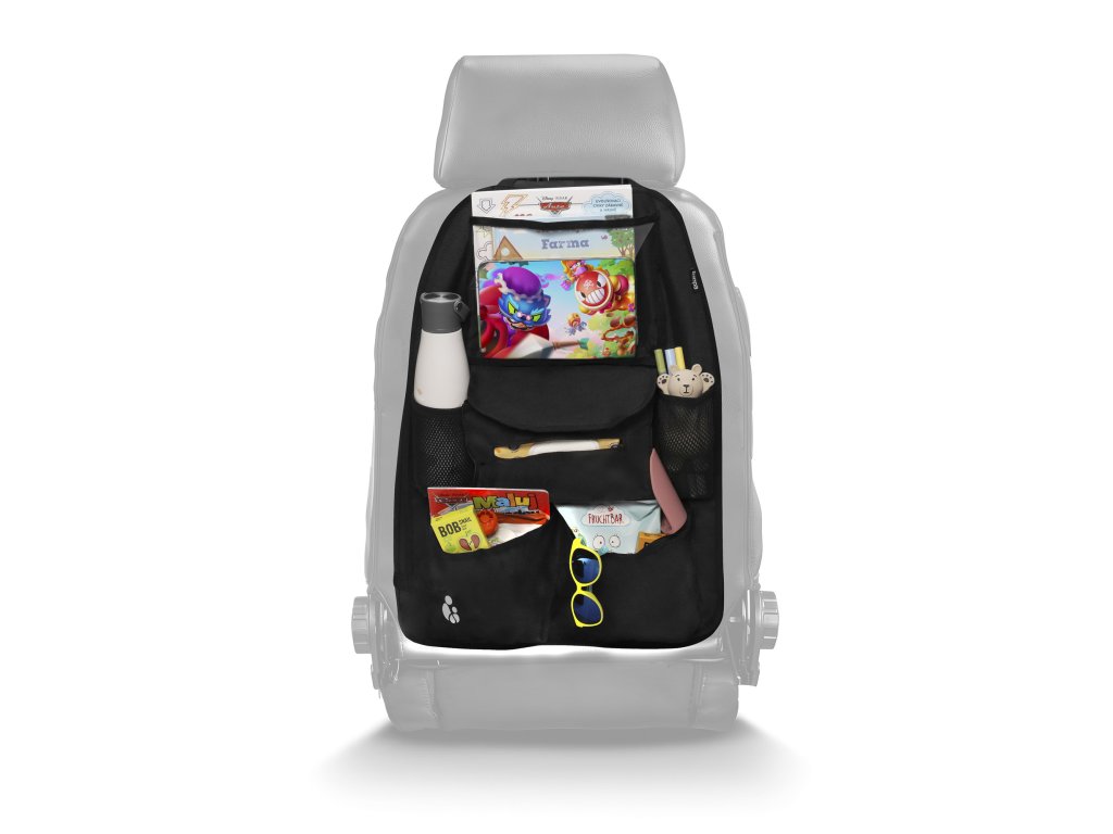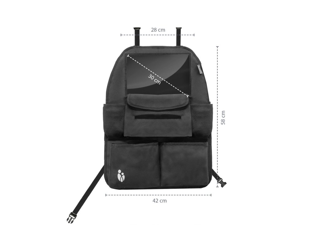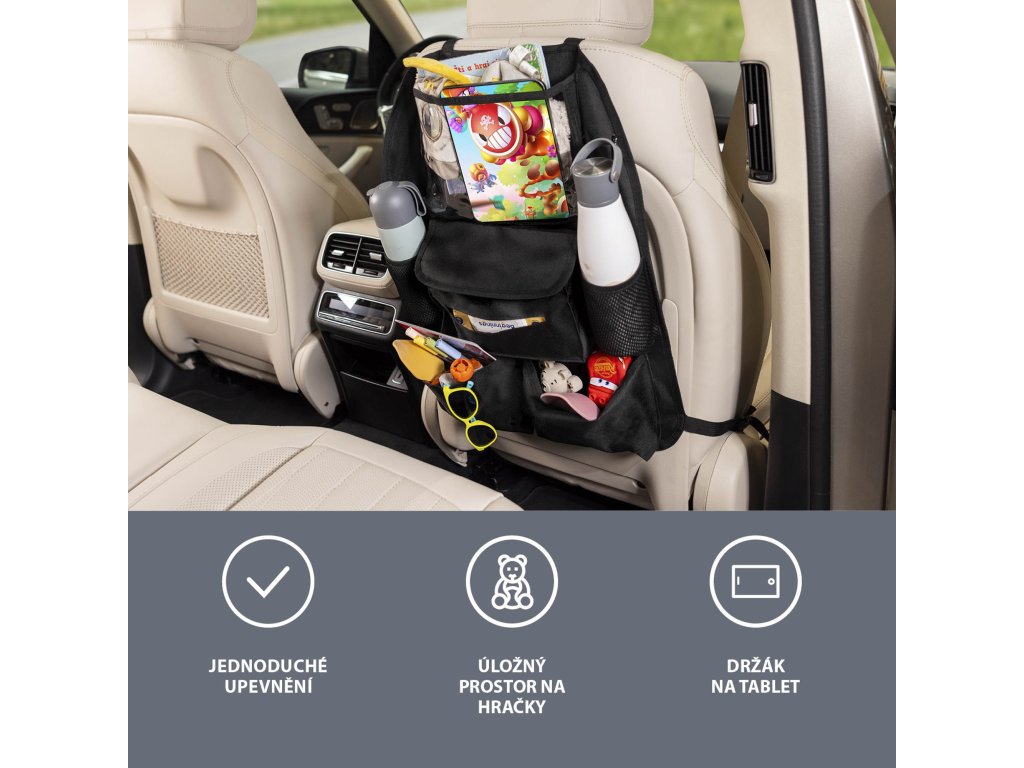Chytrý a efektivní organizér na sedadlo auta zpříjemní cestu nejen vám, ale díky kapse na tablet také vašim dětem, které se mohou zabavit sledováním pohádek. Organizér udrží na svém místě také dvě lahve na nápoje, takže se není třeba obávat vylití. Kapsa na kapesníčky a dvě hluboké kapsy na další předměty, jako jsou třeba hračky, dělají z organizéru příjemnou cestovní pomůcku, která pomůže udržet pořádek ve voze i při cestování s vašimi nejmenšími. Organizér se díky přezkám snadno připevní na zadní stranu sedadla a snadno ho také odejmete.