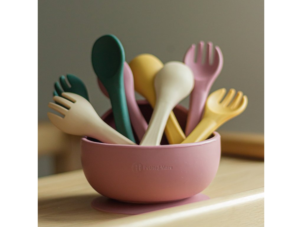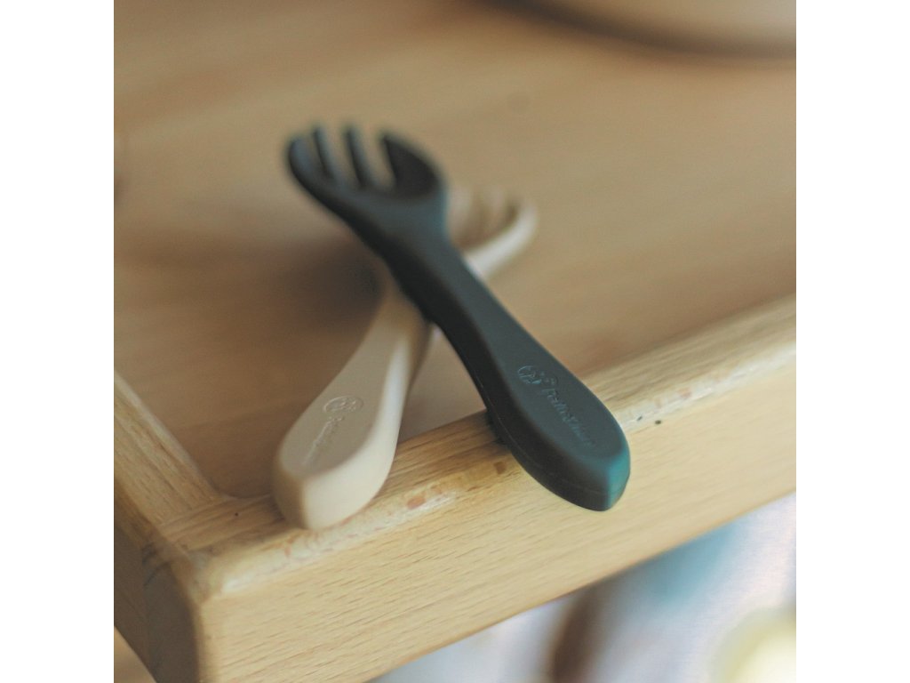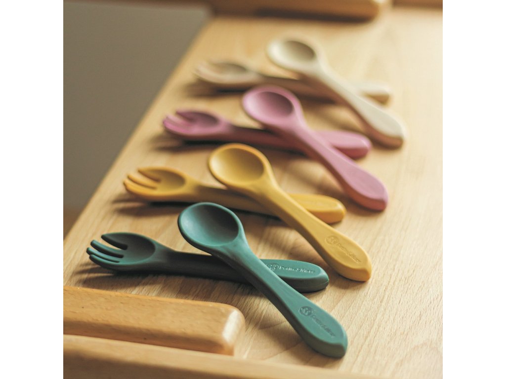 Souprava sestávající z vidličky a lžičky je celá vyrobena z potravinářského silikonu bez obsahu BPA. Díky tomu může vaše dítě jíst příborem teplá i studená jídla. Díky pružnému silikonu je příbor ideální pro citlivé dásně malého dítěte. Příbor je vhodný pro děti od 6 měsíců, které se seznamují s pestrou stravou, a pro ty, které se již úspěšně učí jíst samy. Zaoblené tvary a malé rozměry usnadňují děťátku jejich uchopení a tím i papání.