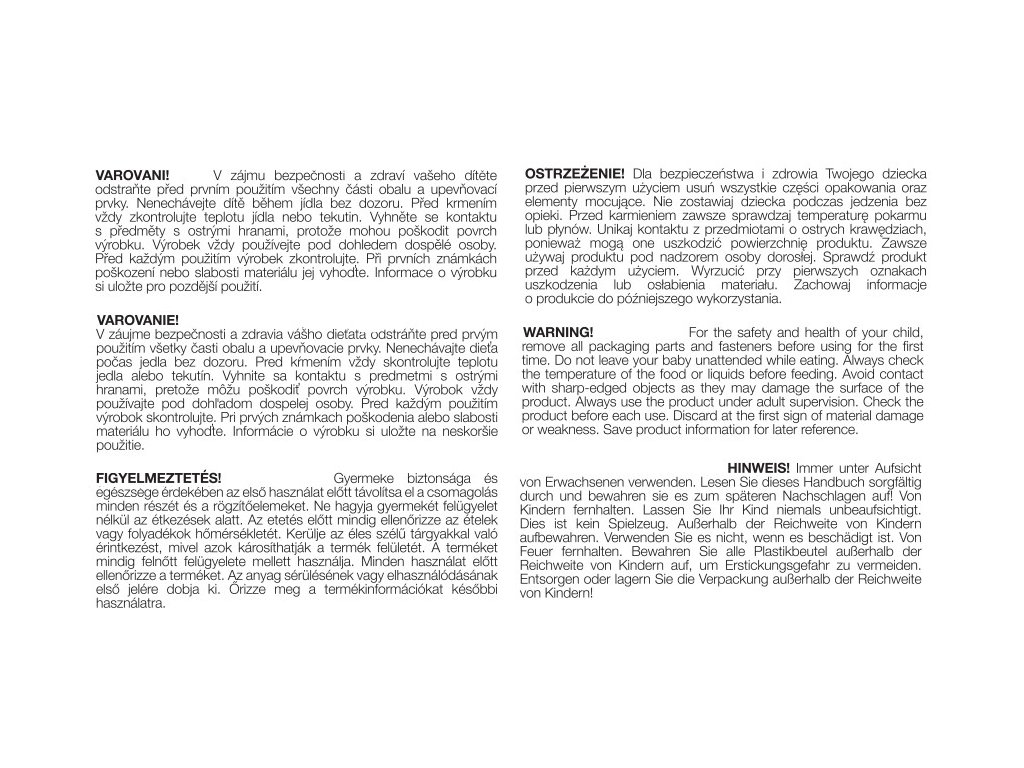 UPOZORNĚNÍ V zájmu bezpečnosti a zdraví vašeho dítěte odstraňte před prvním použitím všechny části obalu a upevňovací prvky. Nenechávejte dítě během jídla bez dozoru. Před krmením vždy zkontrolujte teplotu jídla nebo tekutin. Vyhněte se kontaktu s předměty s ostrými hranami, protože mohou poškodit povrch výrobku. Výrobek vždy používejte pod dohledem dospělé osoby. Před každým použitím výrobek zkontrolujte. Při prvních známkách poškození nebo slabosti materiálu jej vyhoďte. Informace o výrobku si uložte pro pozdější použití.