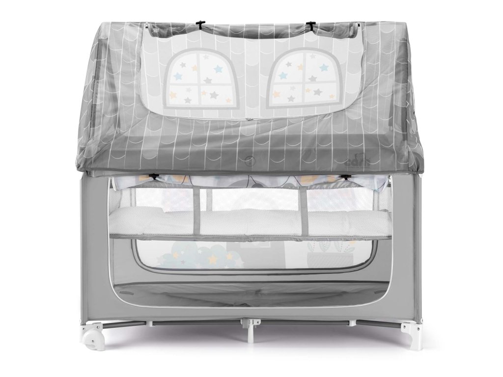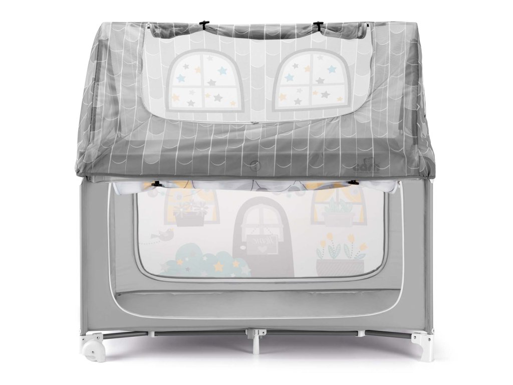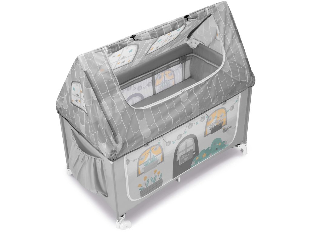 Další přístup k dítěti je skrze stříšku domečku, která se dá vyhrnout nahoru. Uvnitř postýlky je měkká komfortní matrace. Pro nejmenší děti, které zatím jen leží, lze zvednout spodek ohrádky do její poloviny.