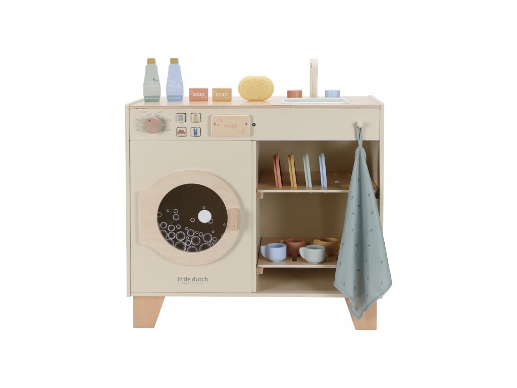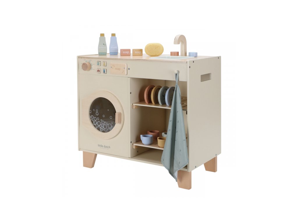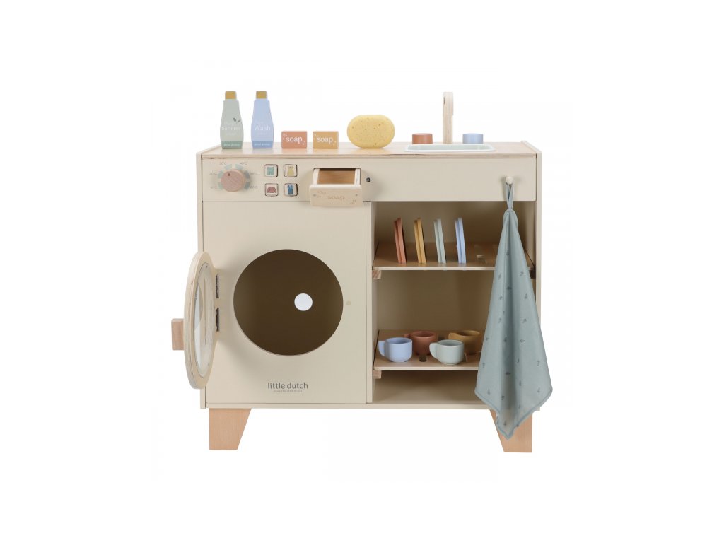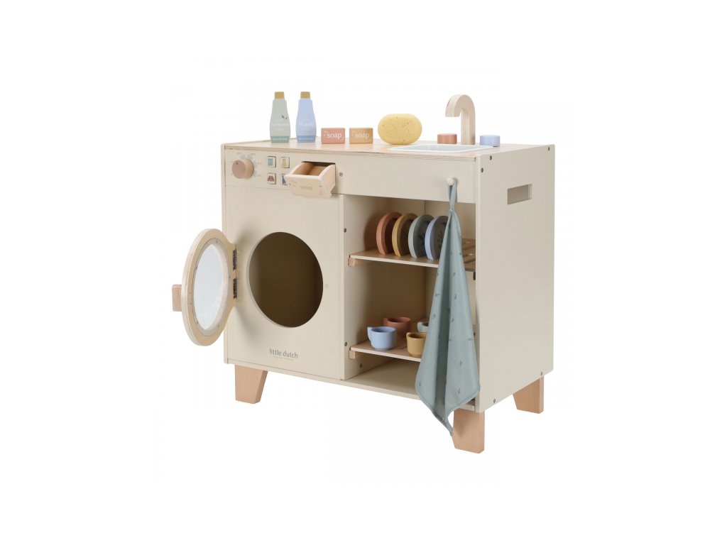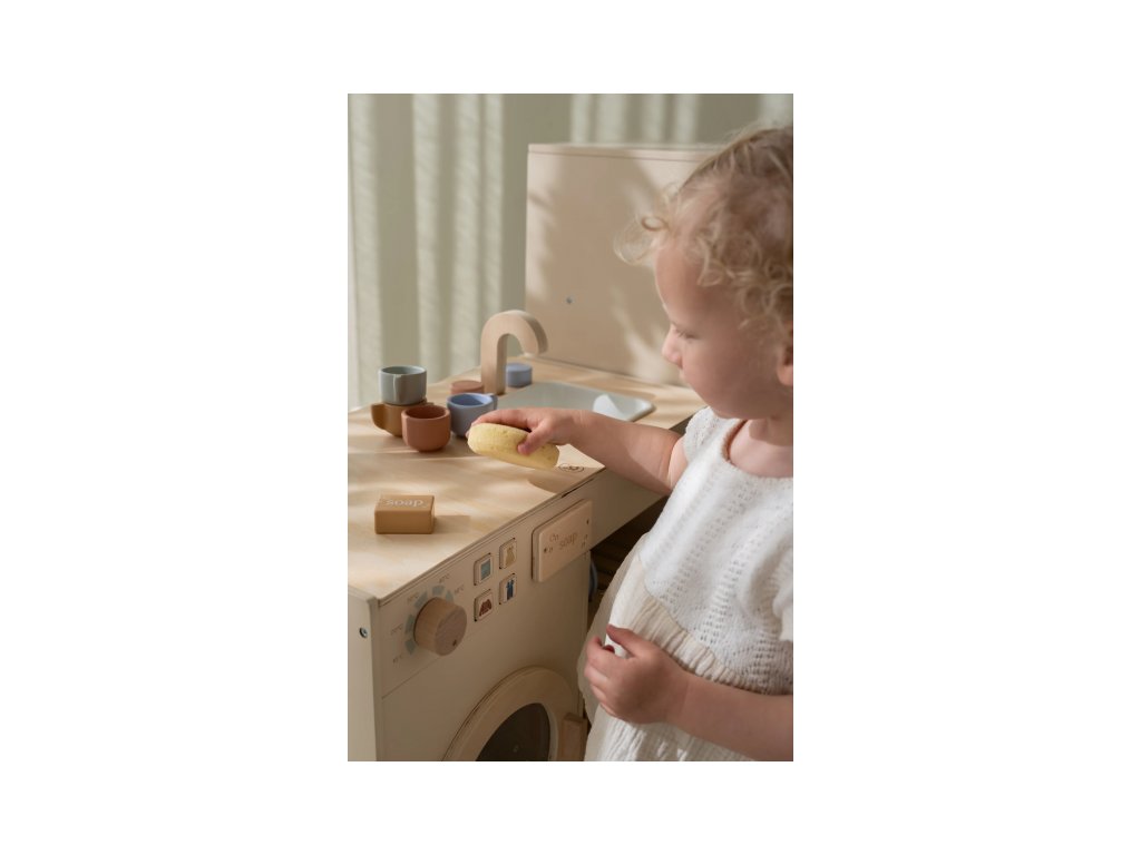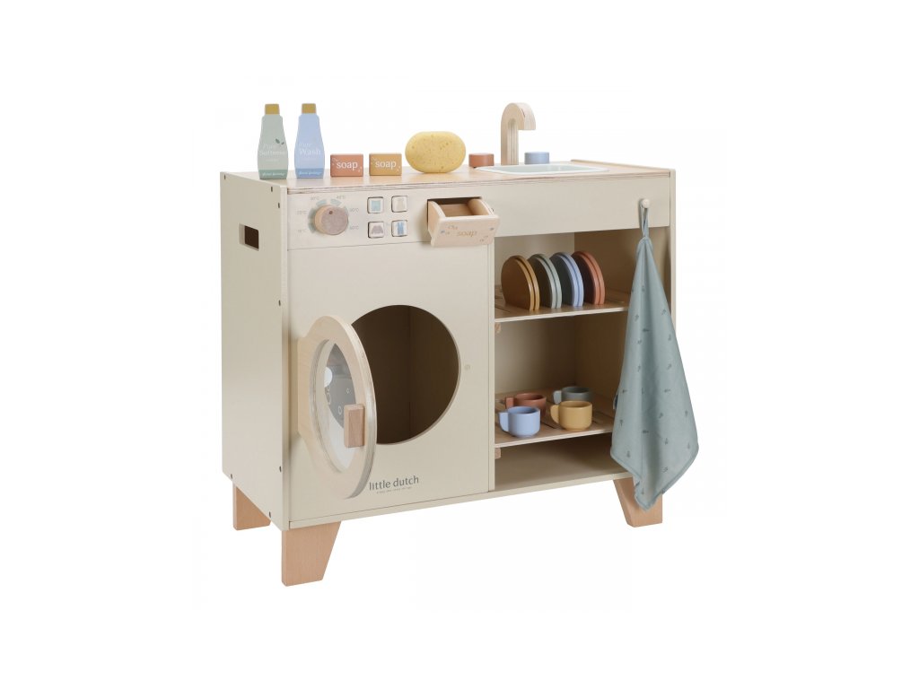Stylový dřevěný set pračky a dřezu Little Dutch potěší každé dítě, které se rádo stará o své panenky či plyšáky. V pračce jim vypere jejich oblečky, v dřezu umyje nádobí, na kterém servírovalo panenkám svačinku. Díky otočným knoflíkům, tlačítkům i vysunovací přihrádce na prací prostředek působí pračka i dřez realisticky a podněcují děti k nápodobě domácích prací. Součástí balení je bohaté příslušenství: čtyři šálky, čtyři podšálky, mycí houba, prací prostředek, mýdlové kostky a látková utěrka. Díky možnosti kombinace s kuchyňkou a lednicí z kolekce dřevěných hraček Little Dutch lze vytvořit plně vybavenou herní kuchyň. Tu pak můžete doplnit dalšími dřevěnými hračkami Little Dutch, např. kávovarem, toustovačem, kuchyňskou váhou, krájecím ovocem, krájecí zeleninou, čajovým servisem apod. Děti se učí napodobováním svých rodičů a zároveň taková hra rozvíjí kreativitu, soustředění, jemnou motoriku a sociální dovednosti. Vyrobeno z odolného FSC certifikovaného dřeva. Rozměry: 65 x 60 x 34 cm Vhodné pro děti od 3 let.Doplňkové parametry