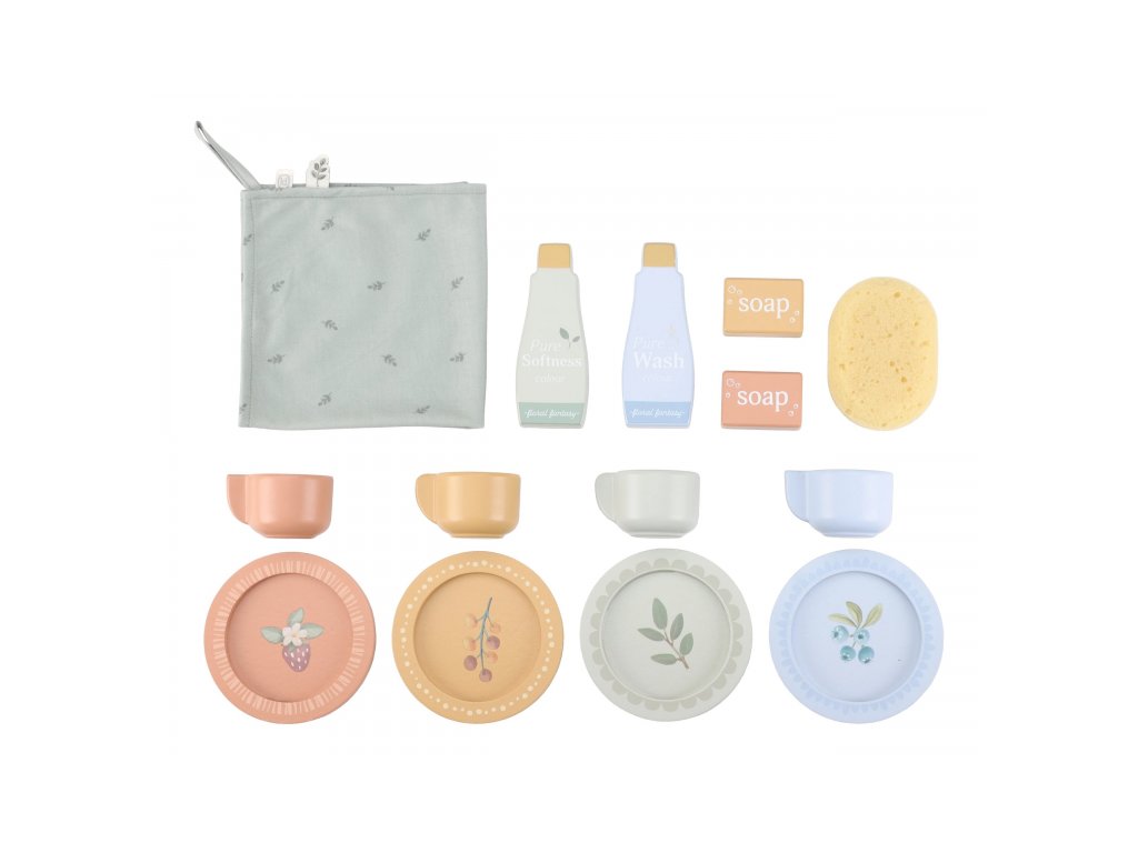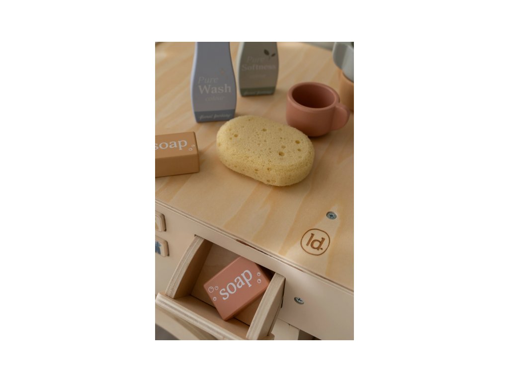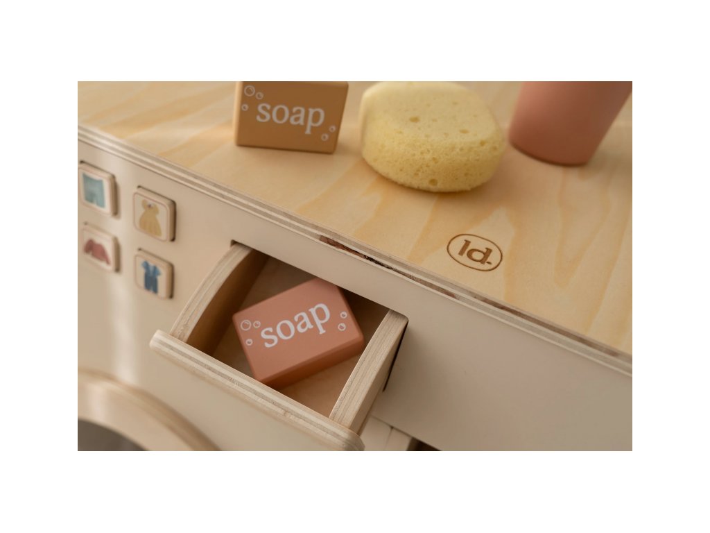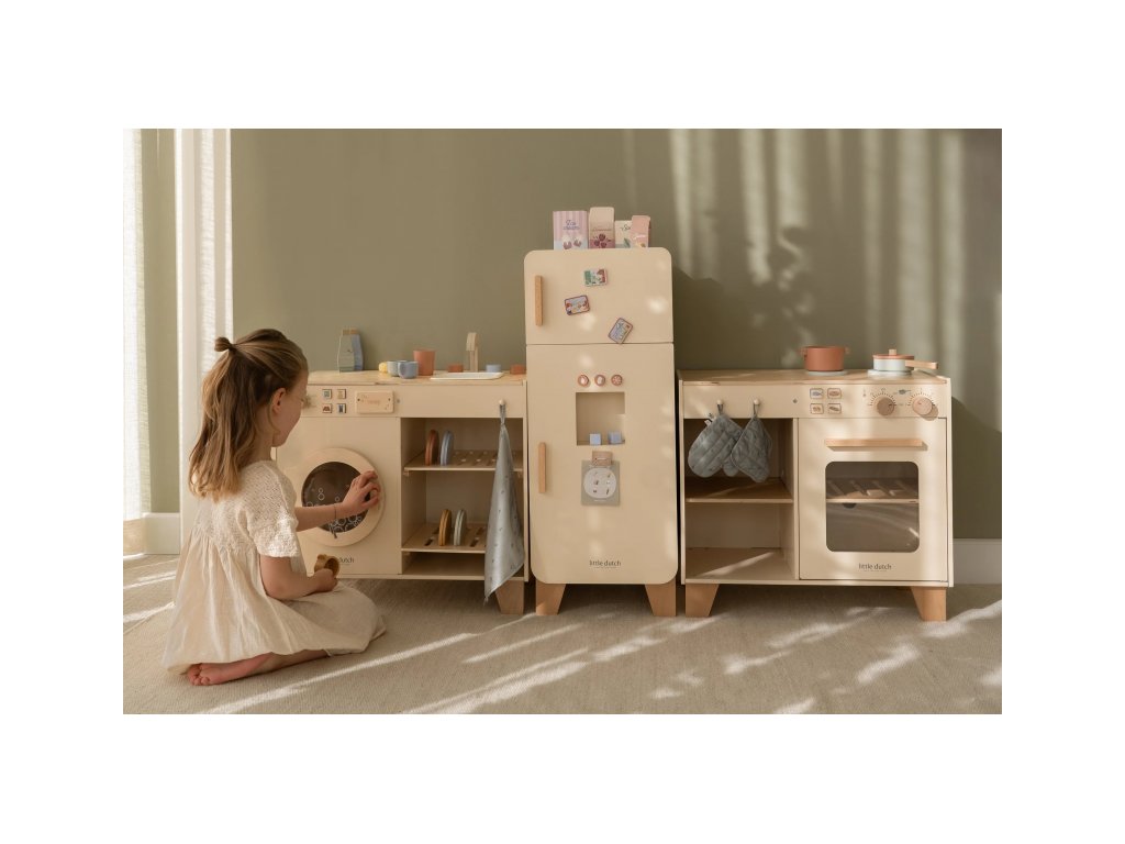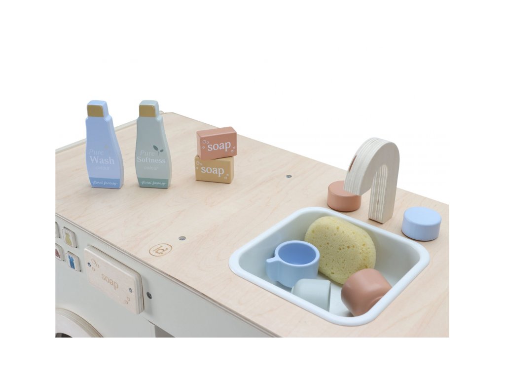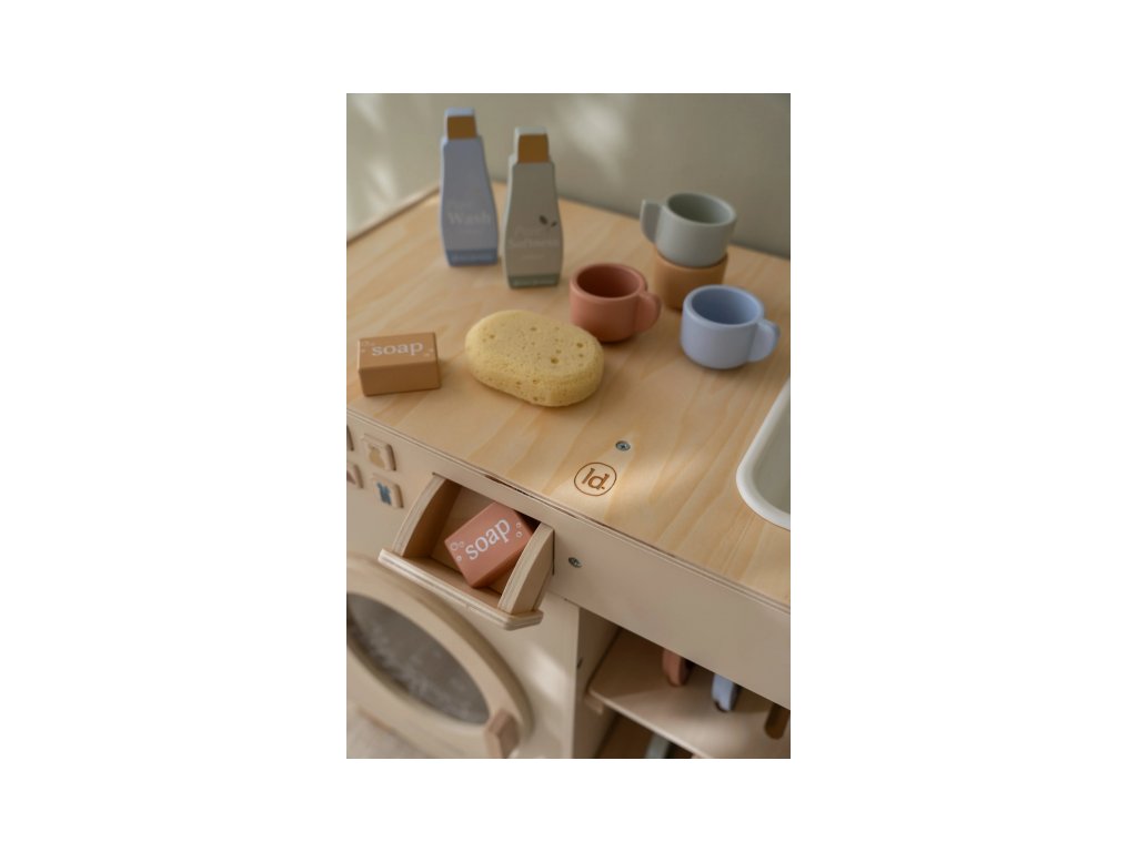 Stylový dřevěný set pračky a dřezu Little Dutch potěší každé dítě, které se rádo stará o své panenky či plyšáky. V pračce jim vypere jejich oblečky, v dřezu umyje nádobí, na kterém servírovalo panenkám svačinku. Díky otočným knoflíkům, tlačítkům i vysunovací přihrádce na prací prostředek působí pračka i dřez realisticky a podněcují děti k nápodobě domácích prací. Součástí balení je bohaté příslušenství: čtyři šálky, čtyři podšálky, mycí houba, prací prostředek, mýdlové kostky a látková utěrka. Díky možnosti kombinace s kuchyňkou a lednicí z kolekce dřevěných hraček Little Dutch lze vytvořit plně vybavenou herní kuchyň. Tu pak můžete doplnit dalšími dřevěnými hračkami Little Dutch, např. kávovarem, toustovačem, kuchyňskou váhou, krájecím ovocem, krájecí zeleninou, čajovým servisem apod. Děti se učí napodobováním svých rodičů a zároveň taková hra rozvíjí kreativitu, soustředění, jemnou motoriku a sociální dovednosti. Vyrobeno z odolného FSC certifikovaného dřeva. Rozměry: 65 x 60 x 34 cm Vhodné pro děti od 3 let.Doplňkové parametry