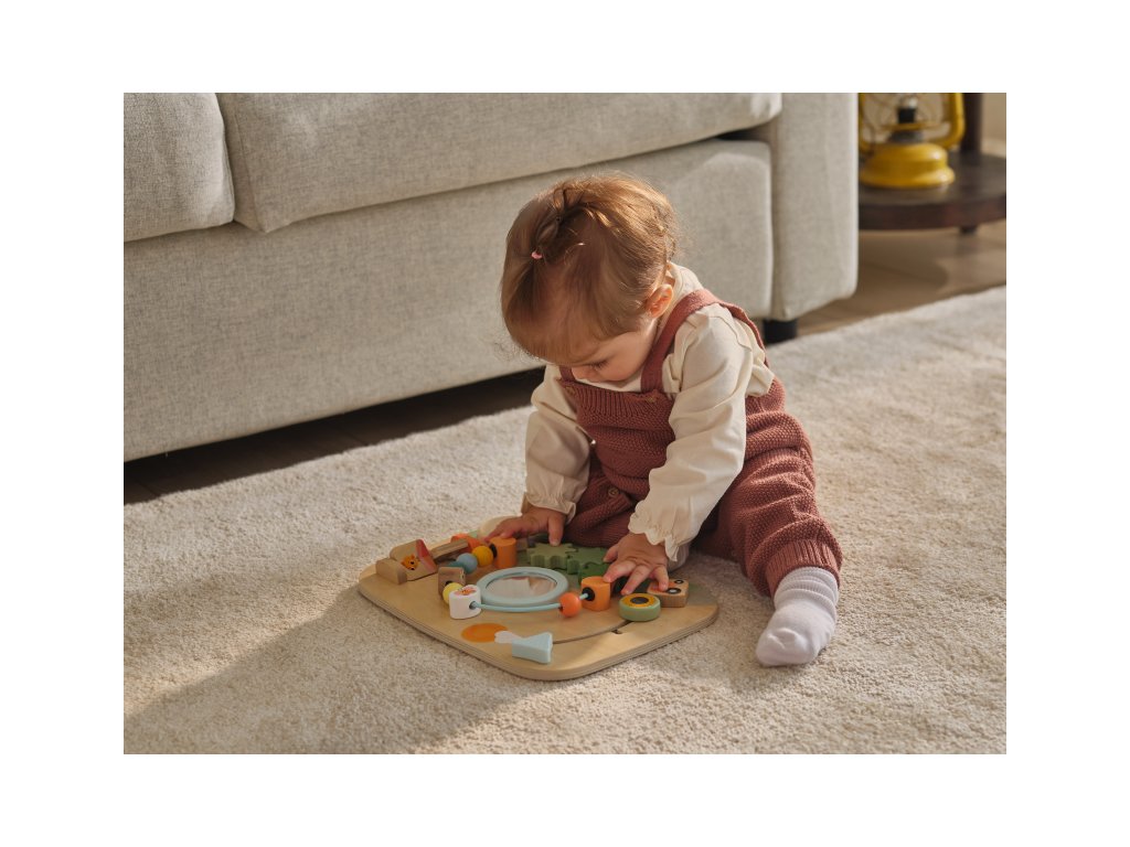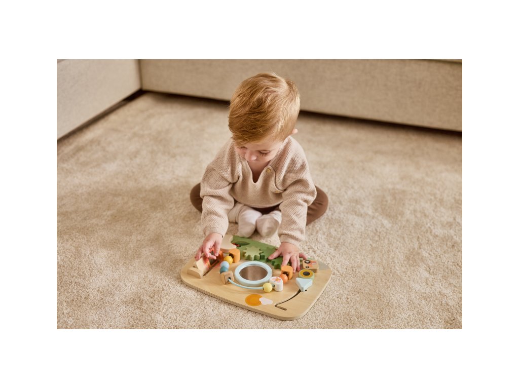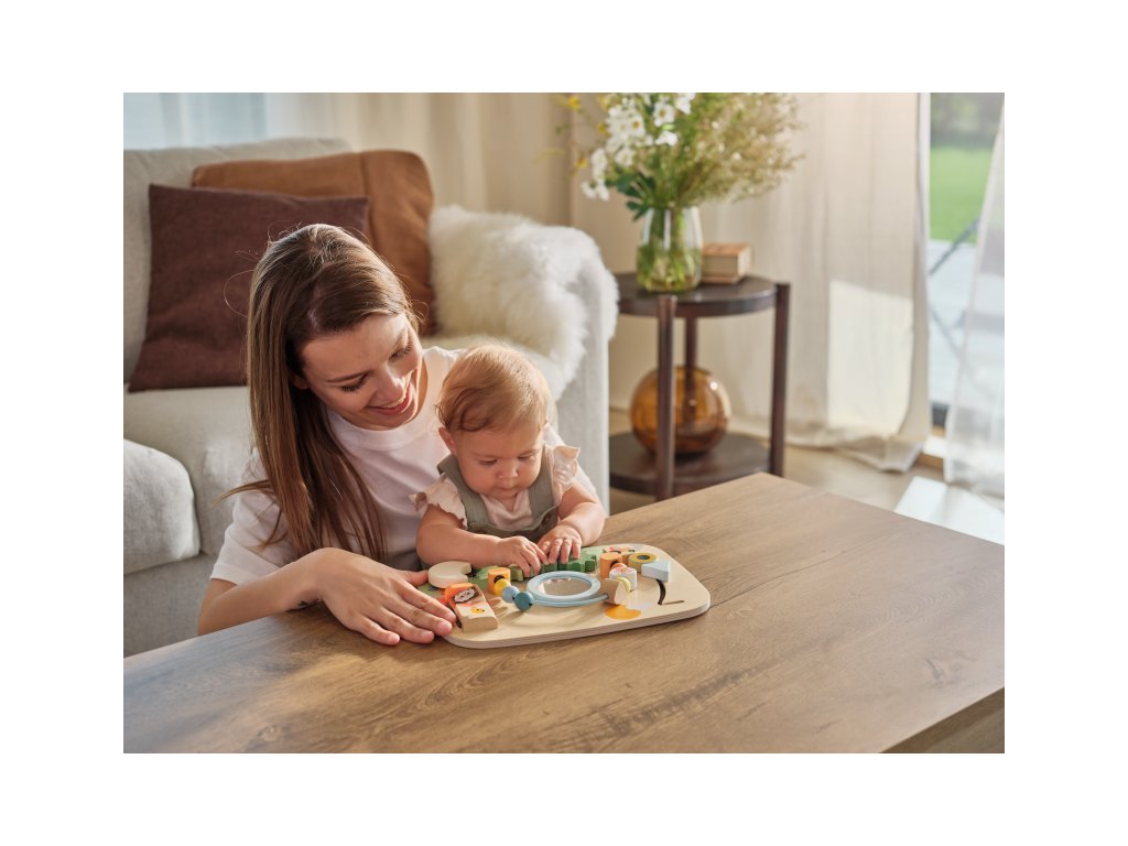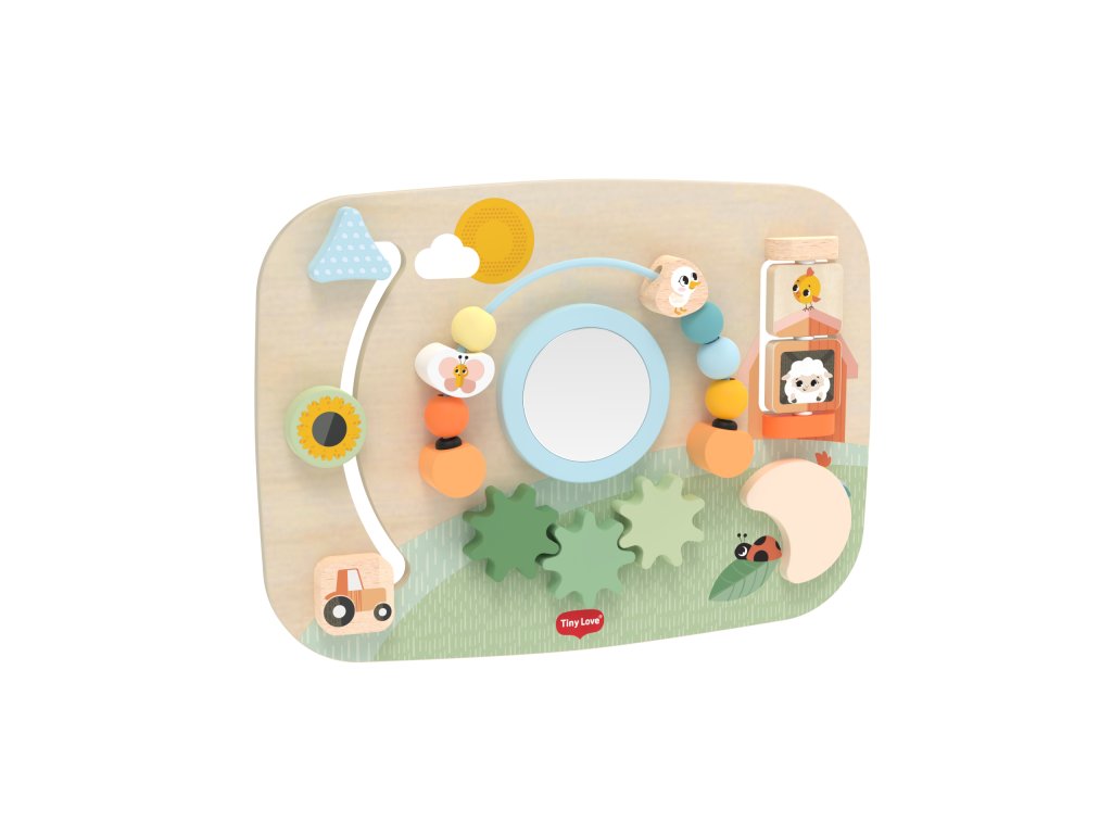 Dřevěný pult s aktivitami Tiny Love je hračka plná pohyblivých prvků, která podporuje objevování, soustředění i první logické uvažování. Pult je navržený tak, aby rostl s dítětem: hodí se pro hru na bříšku, vsedě i ve stoje, a je tak využitelný v různých vývojových fázích dítěte. Díky aktivitám, které se dobře ovládají malými prstíky, podporuje samostatné hraní a pomáhá rozvíjet jemnou motoriku, koordinaci, emoční inteligenci i jednotlivé smysly dítěte. Krásné ilustrace motivů ze života na farmě vybízí i k vyprávění příběhů a společné hře rodiče s dítětem. Snadno přenosná hračka vhodná i na cesty je vyrobena z kvalitního dřeva z odpovědně obhospodařovaných lesů. Rozměry: 29 x 22 x 3,6 cm Vhodné pro děti od 9 měsíců.Doplňkové parametry