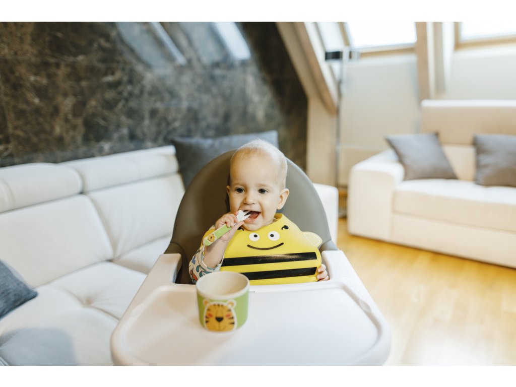 Měkký, lehký, pružný a pohodlný silikonový bryndák s veselým motivem ochraňuje vaše děťátko a jeho oblečení proti ušpinění při krmení. Má praktickou kapsu na padající jídlo a nastavitelné zapínání okolo krku. Snadno se čistí vlhkým hadříkem