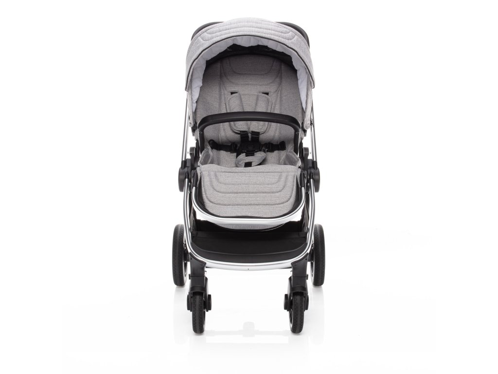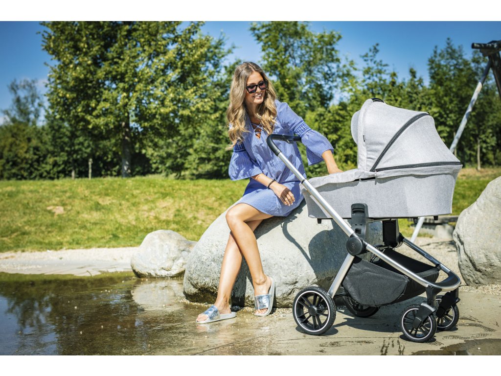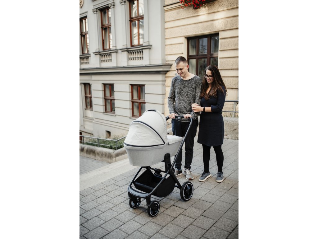 Pokud jste vyššího vzrůstu, u kočárku jistě oceníte výškově nastavitelnou rukojeť, která je, stejně jako hrazda, vyrobena z eko-kůže. Což rovněž podtrhuje moderní design kočárku. Pro snadnější manipulaci můžete hrazdu hbitě odepnout a odklonit na stranu. Tím si usnadníte vkládání dítěte do kočárku, kde ho bezpečně připoutáte 5bodovým bezpečnostním pásem. Pro zajištění kočárku samozřejmě nechybí ani centrální brzda.