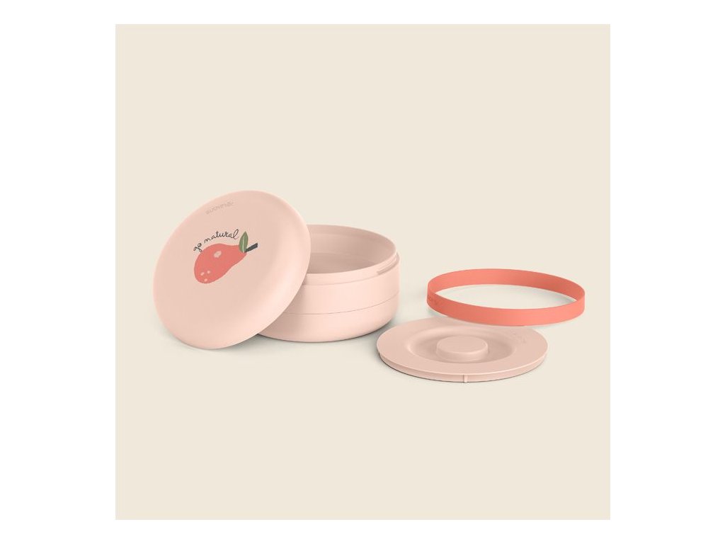 Poskytuje prostor pro dvě jídla. Spodní hlubší přihrádka na pyré nebo jinou mixovanou dětskou výživu s kapacitou 285 ml. Ochranný vniřní kryt. Šroubovací víčko, které lze otevřít a uzavřít jednou otáčkou. Střední přihrádka je určená pro pevné potraviny s kapacitou 210 ml.