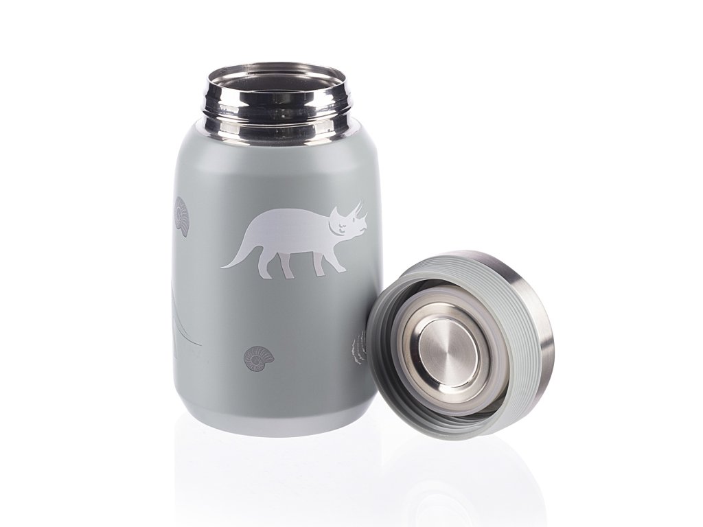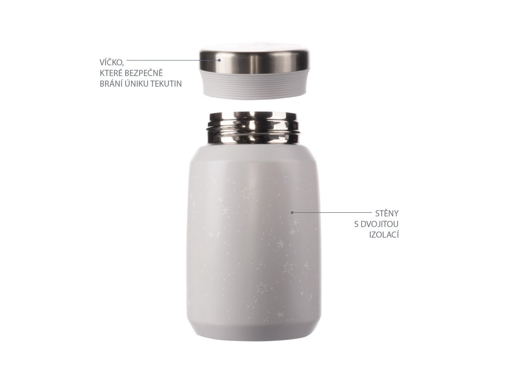 která je odolná vůči korozi. Těsné víčko zajišťuje, že termoska neprotéká. Díky