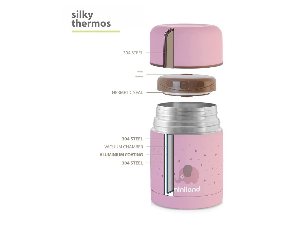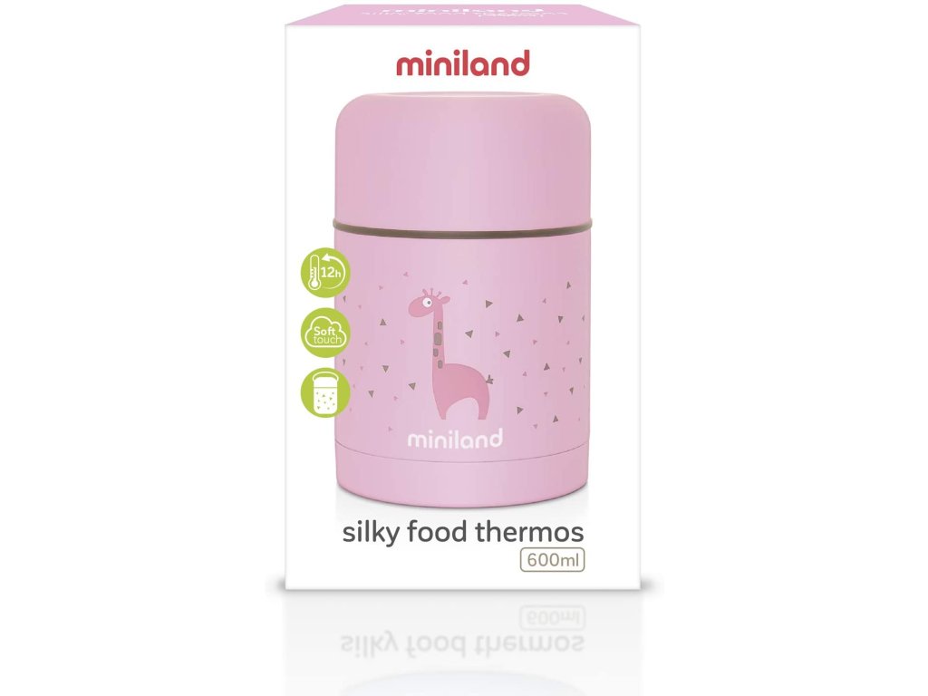 Vakuová termoska Miniland Silky je vyrobena z vysoce kvalitní dvoustěnné oceli a díky tomu udrží až 12 hodin požadovanou teplotu dětského příkrmu. Termoska je potažena jemným materiálem pro příjemné uchopení. Objem 600 ml. Neobsahuje BPA.