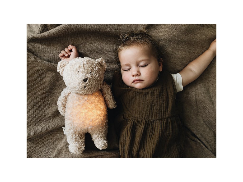 Moonie usínáček v podobě roztomilého medvídka s nočním světlem a relaxačními zvuky pomáhá miminku uklidnit se a snáze usnout. Uklidňující zvuky připomínají dítěti prostředí v děloze maminky před jeho narozením. Usínáček nabízí pět přírodních relaxačních zvuků (tlukot srdce, vítr, lesní potok, mořské vlny, déšť), kalimba ukolébavku, dvě klasické ukolébavky a umožňuje nahrání vlastního hlasu. Bříško medvídka svítí a slouží jako noční světlo s výběrem sedmi barev svícení. Jemné světlo pomáhá dítěti cítit se v postýlce bezpečně. Světlo je možné zapnout i bez zvuků. Při zapnuté funkci Shake světlo zapnete zatřesením hračkou. Medvídek se při svícení nijak nezahřívá a je pro dítě zcela bezpečný. Funkce časovače umožňuje nastavit dobu přehrávání na 30, 60 nebo 90 minut, než modul přejde do režimu inteligentního senzoru pláče. Inteligentní senzor aktivuje zvuk a světlo, když dítě začne plakat. Hračka pak přehrává relaxační zvuky a jemně svítí po dobu 20 minut. Hudební modul umožňuje nastavení hlasitosti a doby přehrávání dle vašich preferencí. Hračka se dobíjí s pomocí USB kabelu, k plnému nabití potřebuje 3 hodiny. Plně nabitá baterie vydrží až 8 hodin nepřetržitého provozu se zapnutým světlem a zvukem. USB kabel je součástí balení. Po vyjmutí zvukového a svítícího modulu můžete hračku prát v ruce. Medvídek je součástí produktové řady Moonie Organic, vyráběné z cetifikované organické bavlny, barvené netoxickými barvami. Bavlna pochází z produkce bez použití pesticidů a toxických hnojiv. Při pěstování organické bavlny se používá o 50% méně vody ve srovnání s průmyslovým pěstováním. Výplň hračky tvoří recyklovaný materiál. Hračka byla testována švýcarskou laboratoří SGS a je v souladu se směrnicí 2009/48/ES o bezpečnosti hraček. Rozměry: 28 x 16 x 10,5 cm Vhodné pro děti od narození.Doplňkové parametry