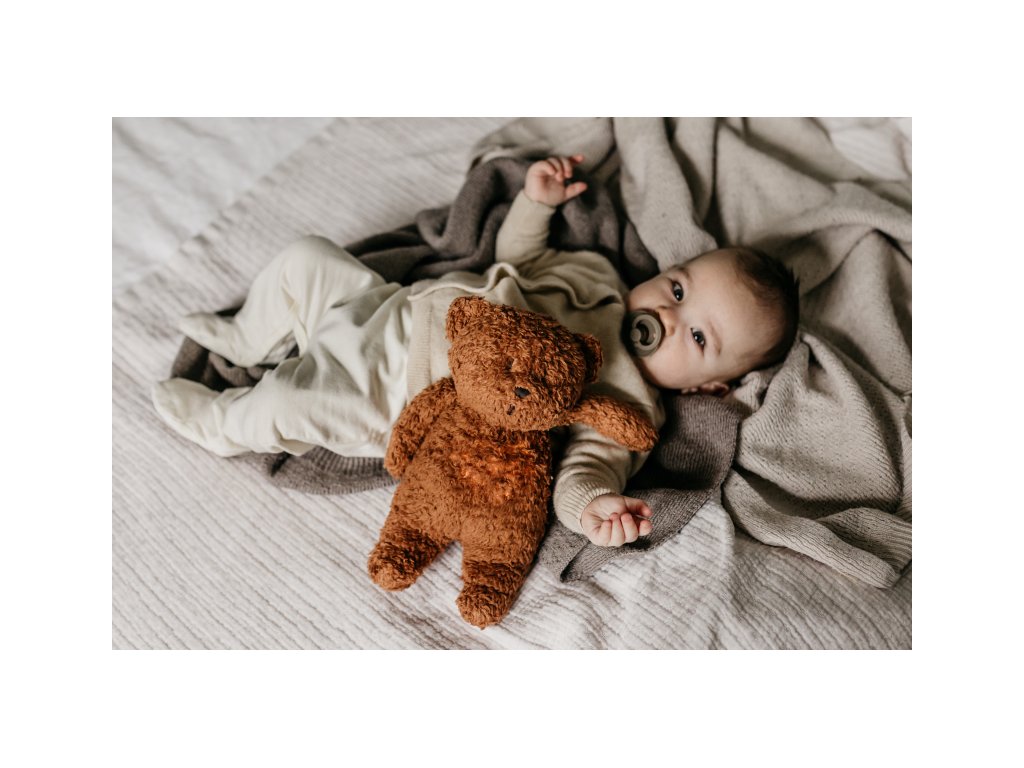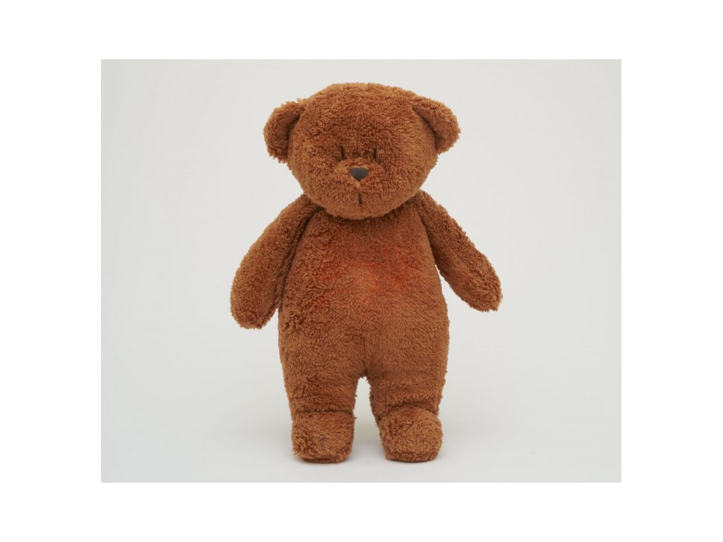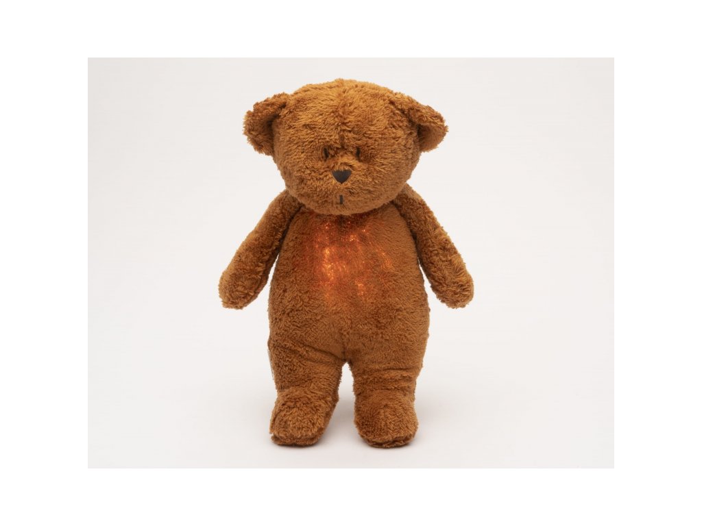 Moonie usínáček v podobě roztomilého medvídka s nočním světlem a relaxačními zvuky pomáhá miminku uklidnit se a snáze usnout. Uklidňující zvuky připomínají dítěti prostředí v děloze maminky před jeho narozením. Usínáček nabízí pět přírodních relaxačních zvuků (tlukot srdce, vítr, lesní potok, mořské vlny, déšť), kalimba ukolébavku, dvě klasické ukolébavky a umožňuje nahrání vlastního hlasu. Bříško medvídka svítí a slouží jako noční světlo s výběrem sedmi barev svícení. Jemné světlo pomáhá dítěti cítit se v postýlce bezpečně. Světlo je možné zapnout i bez zvuků. Při zapnuté funkci Shake světlo zapnete zatřesením hračkou. Medvídek se při svícení nijak nezahřívá a je pro dítě zcela bezpečný. Funkce časovače umožňuje nastavit dobu přehrávání na 30, 60 nebo 90 minut, než modul přejde do režimu inteligentního senzoru pláče. Inteligentní senzor aktivuje zvuk a světlo, když dítě začne plakat. Hračka pak přehrává relaxační zvuky a jemně svítí po dobu 20 minut. Hudební modul umožňuje nastavení hlasitosti a doby přehrávání dle vašich preferencí. Hračka se dobíjí s pomocí USB kabelu, k plnému nabití potřebuje 3 hodiny. Plně nabitá baterie vydrží až 8 hodin nepřetržitého provozu se zapnutým světlem a zvukem. USB kabel je součástí balení. Po vyjmutí zvukového a svítícího modulu můžete hračku prát v ruce. Medvídek je součástí produktové řady Moonie Organic, vyráběné z cetifikované organické bavlny, barvené netoxickými barvami. Bavlna pochází z produkce bez použití pesticidů a toxických hnojiv. Při pěstování organické bavlny se používá o 50% méně vody ve srovnání s průmyslovým pěstováním. Výplň hračky tvoří recyklovaný materiál. Hračka byla testována švýcarskou laboratoří SGS a je v souladu se směrnicí 2009/48/ES o bezpečnosti hraček. Rozměry: 28 x 16 x 10,5 cm Vhodné pro děti od narození.Doplňkové parametry