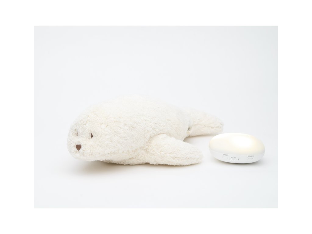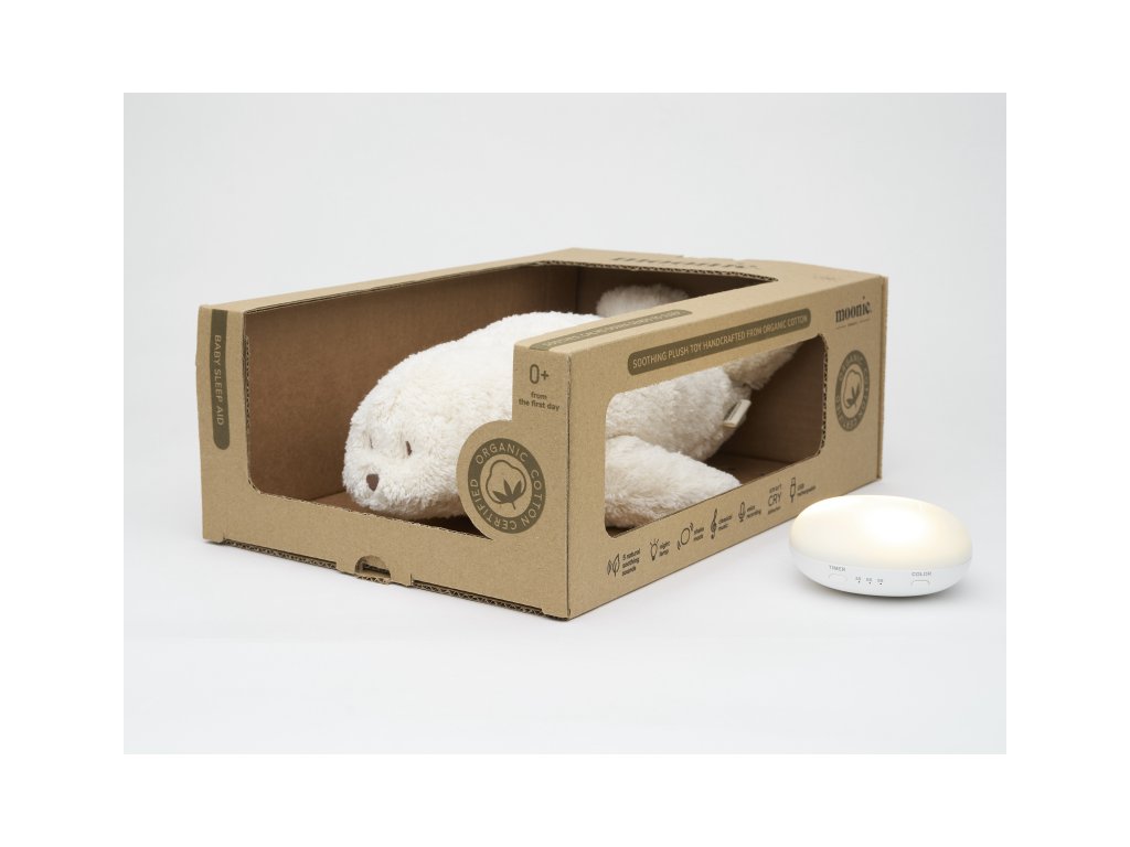 Moonie usínáček v podobě roztomilého tuleně s nočním světlem a relaxačními zvuky pomáhá miminku uklidnit se a snáze usnout. Uklidňující zvuky připomínají dítěti prostředí v děloze maminky před jeho narozením. Usínáček nabízí pět přírodních relaxačních zvuků (tlukot srdce, vítr, lesní potok, mořské vlny, déšť), kalimba ukolébavku, dvě klasické ukolébavky a umožňuje nahrání vlastního hlasu. Bříško tuleně svítí a slouží jako noční světlo s výběrem sedmi barev svícení. Jemné světlo pomáhá dítěti cítit se v postýlce bezpečně. Světlo je možné zapnout i bez zvuků. Při zapnuté funkci Shake světlo zapnete zatřesením hračkou. Tuleň se při svícení nijak nezahřívá a je pro dítě zcela bezpečný. Funkce časovače umožňuje nastavit dobu přehrávání na 30, 60 nebo 90 minut, než modul přejde do režimu inteligentního senzoru pláče. Inteligentní senzor aktivuje zvuk a světlo, když dítě začne plakat. Hračka pak přehrává relaxační zvuky a jemně svítí po dobu 20 minut. Hudební modul umožňuje nastavení hlasitosti a doby přehrávání dle vašich preferencí. Hračka se dobíjí s pomocí USB kabelu, k plnému nabití potřebuje 3 hodiny. Plně nabitá baterie vydrží až 8 hodin nepřetržitého provozu se zapnutým světlem a zvukem. USB kabel je součástí balení. Po vyjmutí zvukového a svítícího modulu můžete hračku prát v ruce. Tuleň je součástí produktové řady Moonie Organic, vyráběné z cetifikované organické bavlny, barvené netoxickými barvami. Bavlna pochází z produkce bez použití pesticidů a toxických hnojiv. Při pěstování organické bavlny se používá o 50% méně vody ve srovnání s průmyslovým pěstováním. Výplň hračky tvoří recyklovaný materiál. Hračka byla testována švýcarskou laboratoří SGS a je v souladu se směrnicí 2009/48/ES o bezpečnosti hraček. Vhodné pro děti od narození.Doplňkové parametry