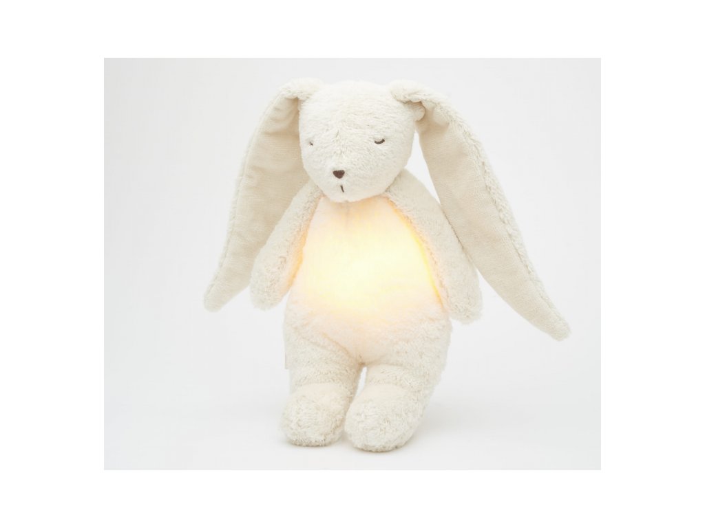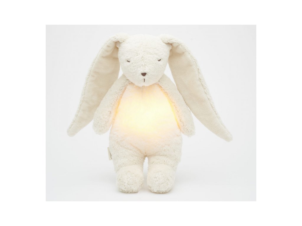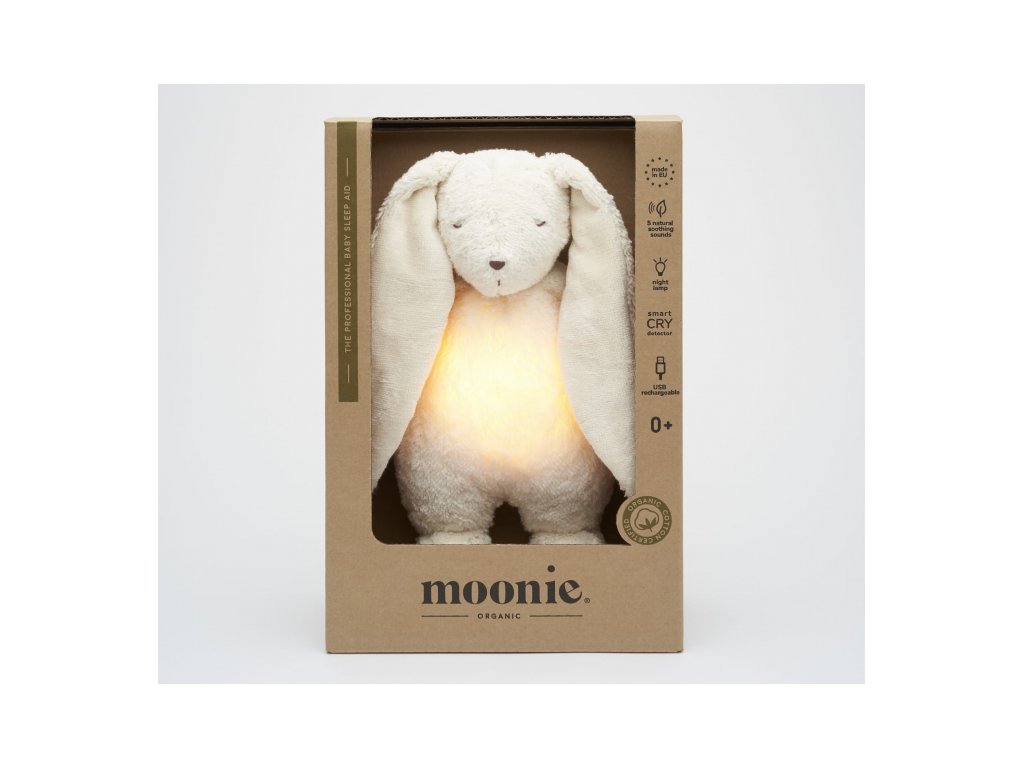 Moonie usínáček v podobě roztomilého zajíčka s nočním světlem a relaxačními zvuky pomáhá miminku uklidnit se a snáze usnout. Uklidňující zvuky připomínají dítěti prostředí v děloze maminky před jeho narozením. Usínáček nabízí pět přírodních relaxačních zvuků (tlukot srdce, vítr, lesní potok, mořské vlny, déšť), kalimba ukolébavku, dvě klasické ukolébavky a umožňuje nahrání vlastního hlasu. Bříško zajíčka svítí a slouží jako noční světlo s výběrem sedmi barev svícení. Jemné světlo pomáhá dítěti cítit se v postýlce bezpečně. Světlo je možné zapnout i bez zvuků. Při zapnuté funkci Shake světlo zapnete zatřesením hračkou. Zajíček se při svícení nijak nezahřívá a je pro dítě zcela bezpečný. Funkce časovače umožňuje nastavit dobu přehrávání na 30, 60 nebo 90 minut, než modul přejde do režimu inteligentního senzoru pláče. Inteligentní senzor aktivuje zvuk a světlo, když dítě začne plakat. Hračka pak přehrává relaxační zvuky a jemně svítí po dobu 20 minut. Hudební modul umožňuje nastavení hlasitosti a doby přehrávání dle vašich preferencí. Hračka se dobíjí s pomocí USB kabelu, k plnému nabití potřebuje 3 hodiny. Plně nabitá baterie vydrží až 8 hodin nepřetržitého provozu se zapnutým světlem a zvukem. USB kabel je součástí balení. Po vyjmutí zvukového a svítícího modulu můžete hračku prát v ruce. Zajíček je součástí produktové řady Moonie Organic, vyráběné z cetifikované organické bavlny, barvené netoxickými barvami. Bavlna pochází z produkce bez použití pesticidů a toxických hnojiv. Při pěstování organické bavlny se používá o 50% méně vody ve srovnání s průmyslovým pěstováním. Výplň hračky tvoří recyklovaný materiál. Hračka byla testována švýcarskou laboratoří SGS a je v souladu se směrnicí 2009/48/ES o bezpečnosti hraček. Rozměry: 28 x 16 x 10,5 cm Vhodné pro děti od narození.Doplňkové parametry