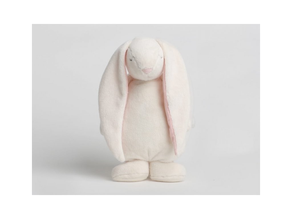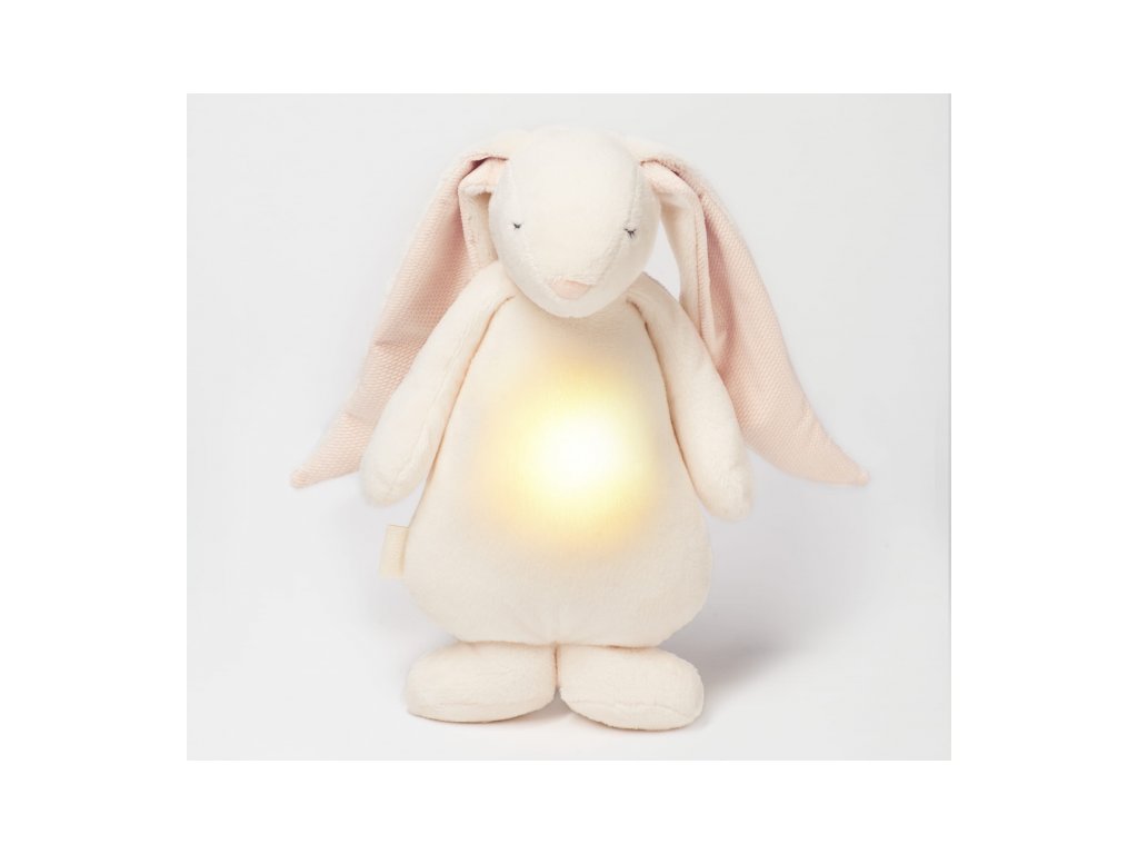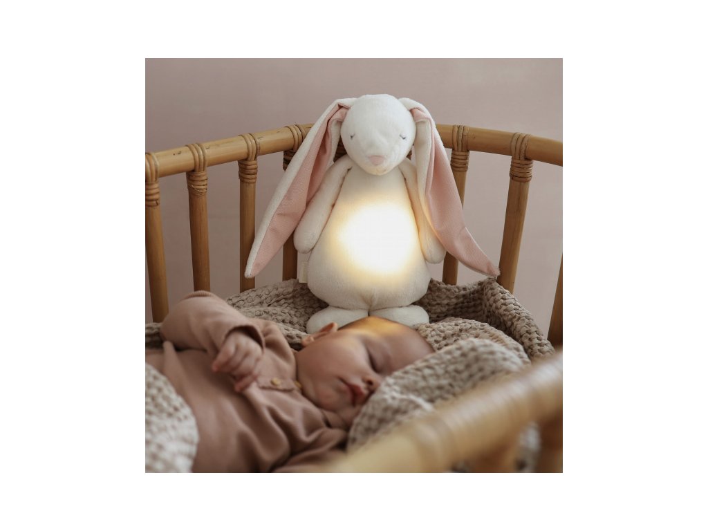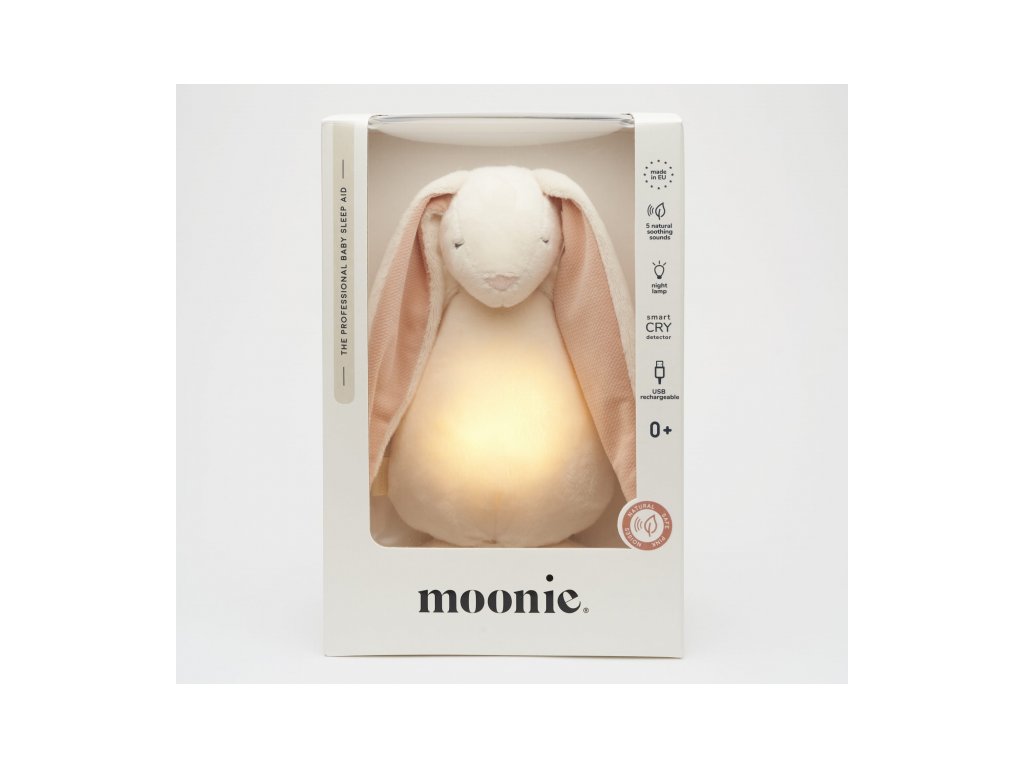 Moonie usínáček v podobě roztomilého zajíčka s nočním světlem a relaxačními zvuky pomáhá miminku uklidnit se a snáze usnout. Uklidňující zvuky připomínají dítěti prostředí v děloze maminky před jeho narozením. Usínáček nabízí pět přírodních relaxačních zvuků (tlukot srdce, vítr, lesní potok, mořské vlny, déšť), kalimba ukolébavku, dvě klasické ukolébavky a umožňuje nahrání vlastního hlasu. Bříško zajíčka svítí a slouží jako noční světlo s výběrem sedmi barev svícení. Jemné světlo pomáhá dítěti cítit se v postýlce bezpečně. Světlo je možné zapnout i bez zvuků. Při zapnuté funkci Shake světlo zapnete zatřesením hračkou. Zajíček se při svícení nijak nezahřívá a je pro dítě zcela bezpečný. Funkce časovače umožňuje nastavit dobu přehrávání na 30, 60 nebo 90 minut, než modul přejde do režimu inteligentního senzoru pláče. Inteligentní senzor aktivuje zvuk a světlo, když dítě začne plakat. Hračka pak přehrává relaxační zvuky a jemně svítí po dobu 20 minut. Hudební modul umožňuje nastavení hlasitosti a doby přehrávání dle vašich preferencí. Hračka se dobíjí s pomocí USB kabelu, k plnému nabití potřebuje 3 hodiny. Plně nabitá baterie vydrží až 8 hodin nepřetržitého provozu se zapnutým světlem a zvukem. USB kabel je součástí balení. Po vyjmutí zvukového a svítícího modulu můžete hračku prát v pračce. Moonie zajíček je vyroben z nejkvalitnějších, certifikovaných a bezpečných materiálů pro děti. Hračka byla testována švýcarskou laboratoří SGS a je v souladu se směrnicí 2009/48/ES o bezpečnosti hraček. Všechny materiály, ze kterých je zajíček MOONIE vyroben, jsou certifikovány OEKO-TEX a jsou super jemné a příjemné na dotek. Rozměry: 28 x 16 x 10,5 cm Vhodné pro děti od narození.Doplňkové parametry